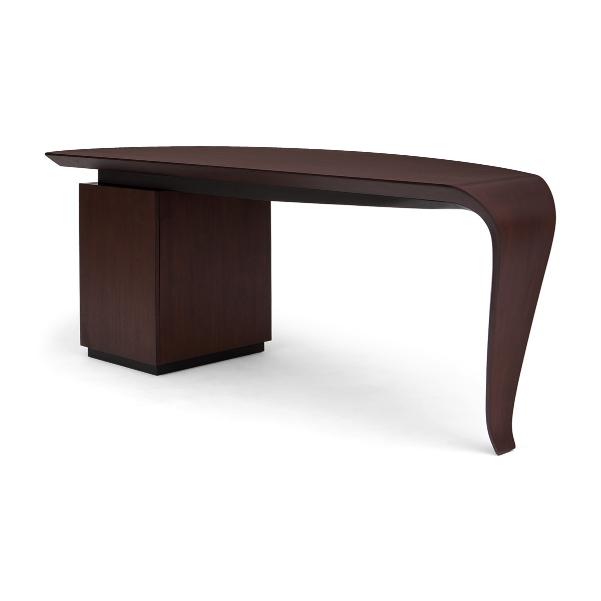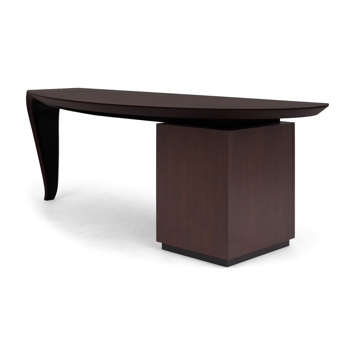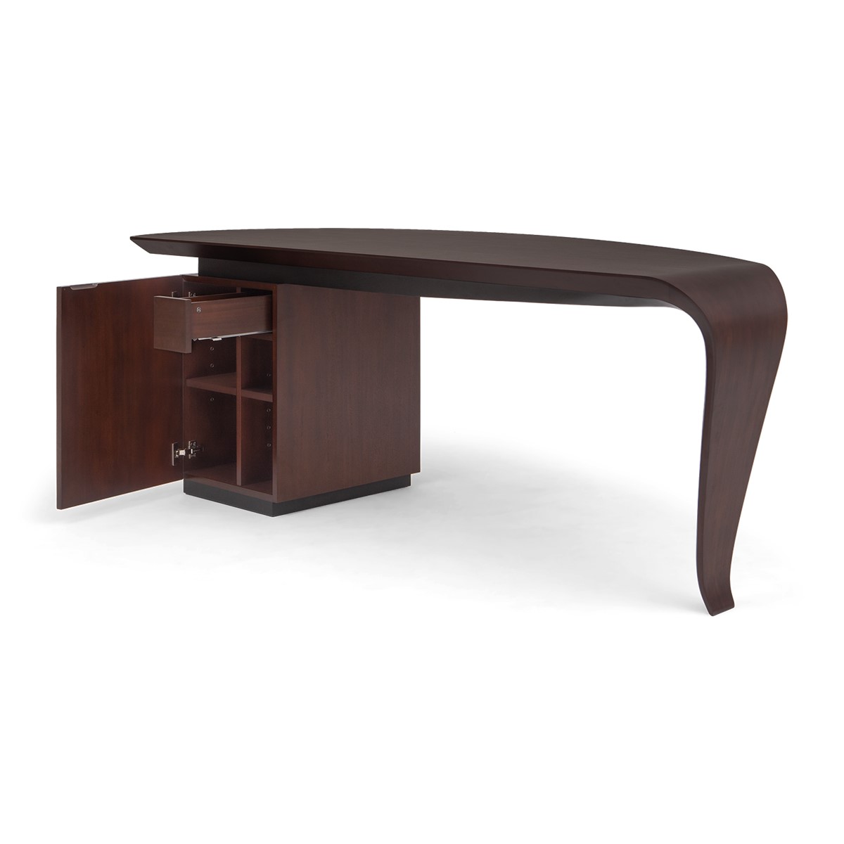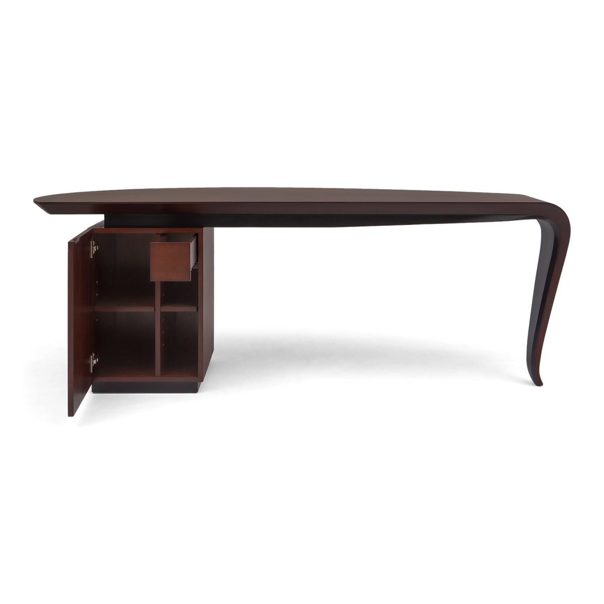 With the elegance of a single sweeping brush stroke, and inspired by the French painter Pierre Soulages, this stunning desk features a hand carved wood top that curves exquisitely into the single desk leg, supported by a cabinet that opens to reveal shelving and a hidden drawer. A truly spectacular CG masterpiece!