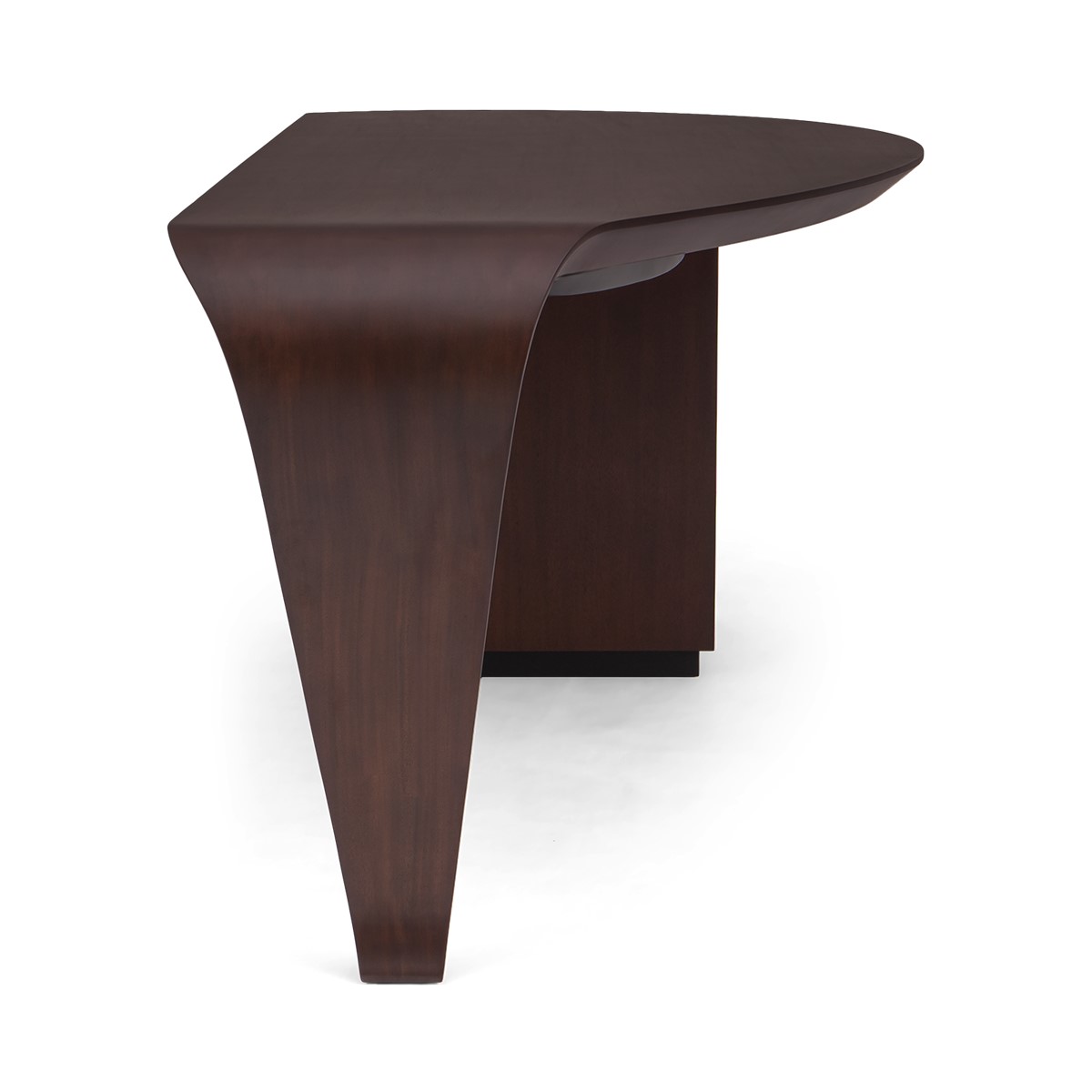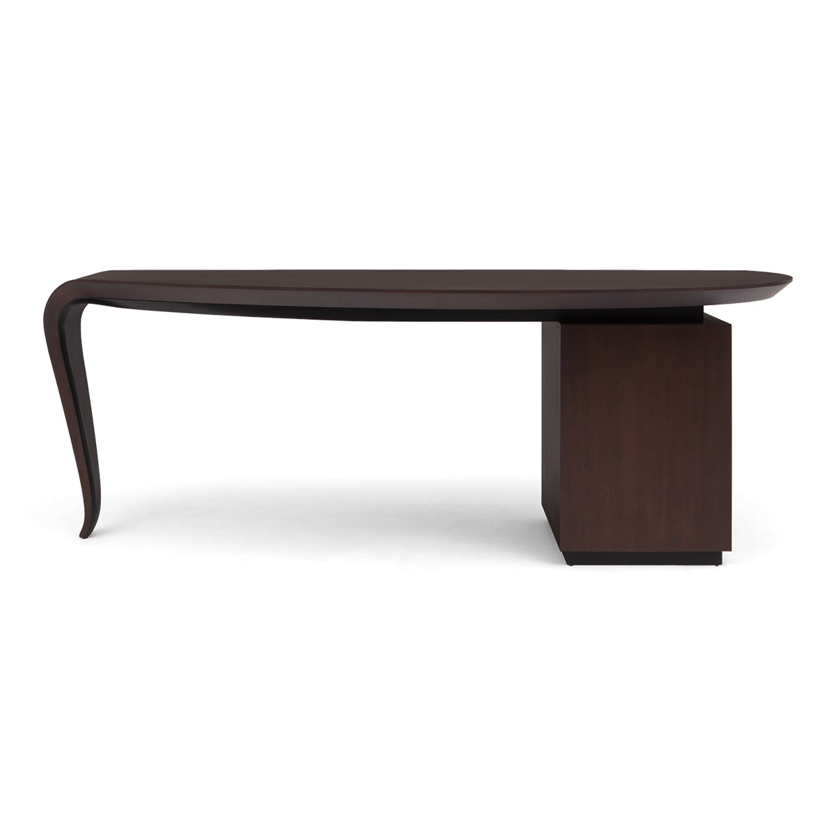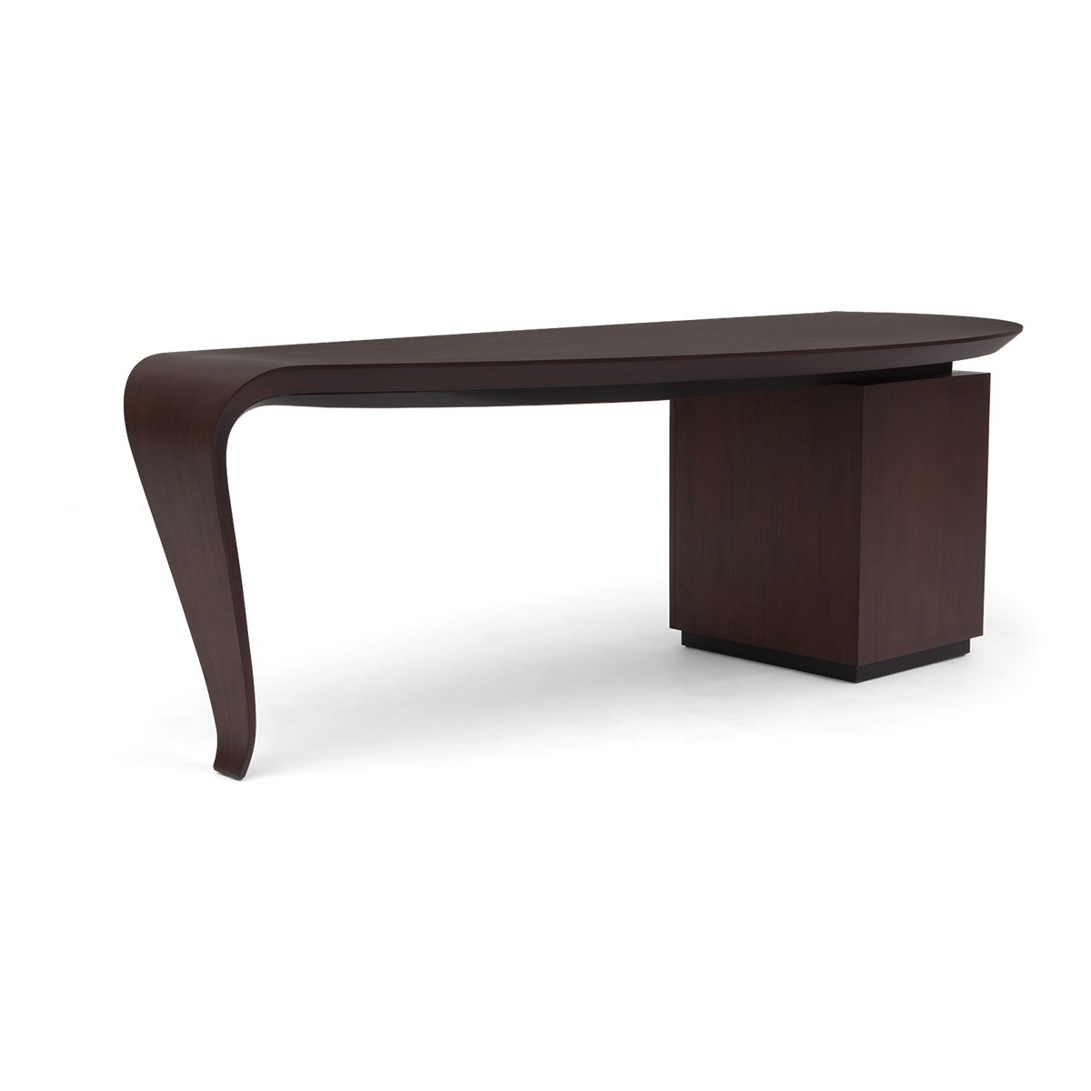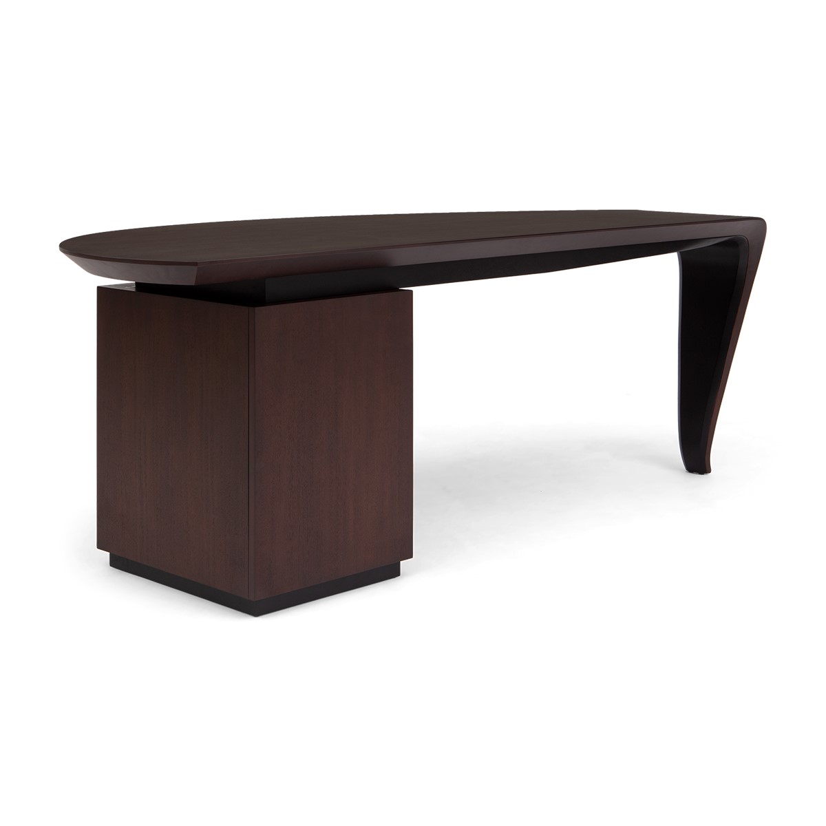 With the elegance of a single sweeping brush stroke, and inspired by the French painter Pierre Soulages, this stunning desk features a hand carved wood top that curves exquisitely into the single desk leg, supported by a cabinet that opens to reveal shelving and a hidden drawer. A truly spectacular CG masterpiece!