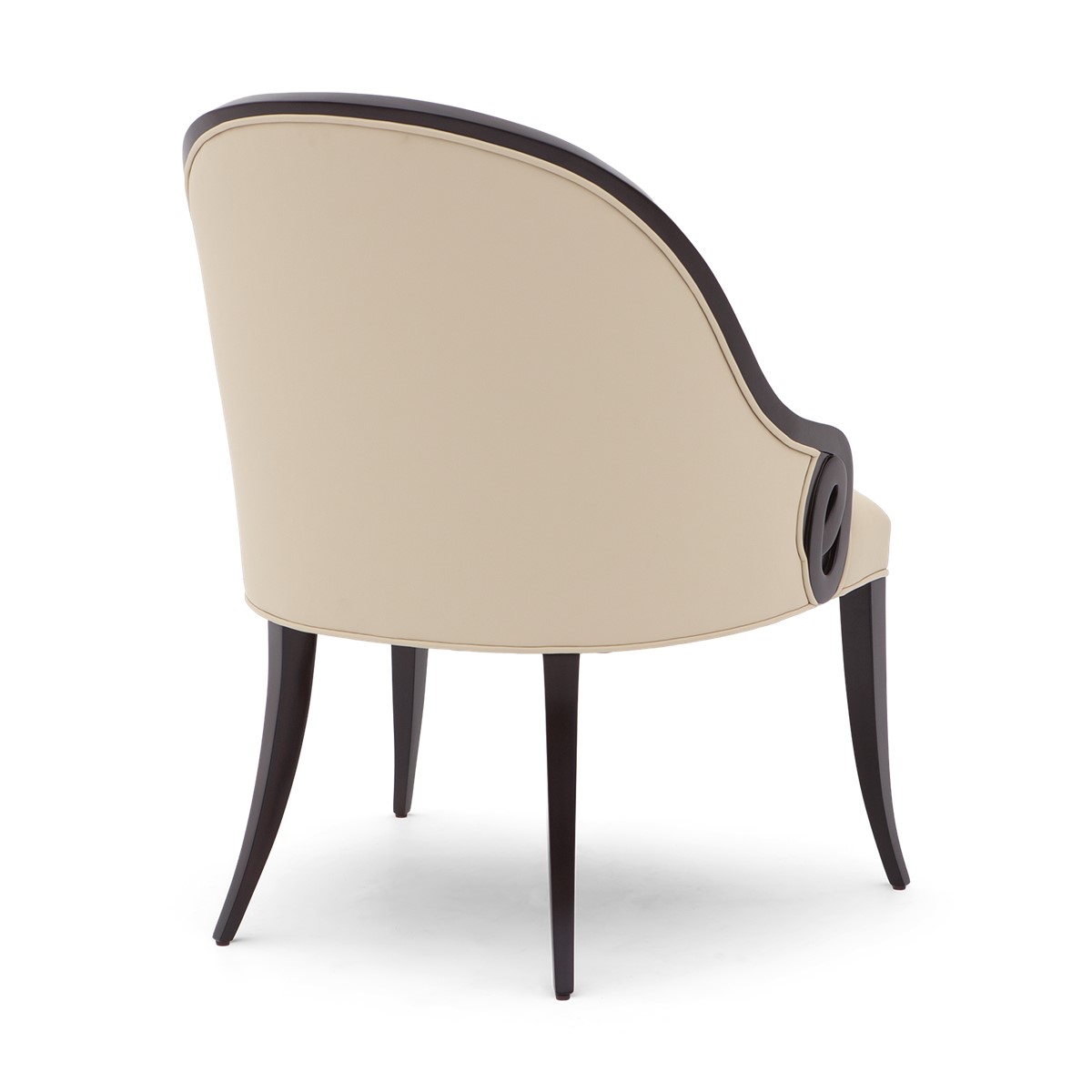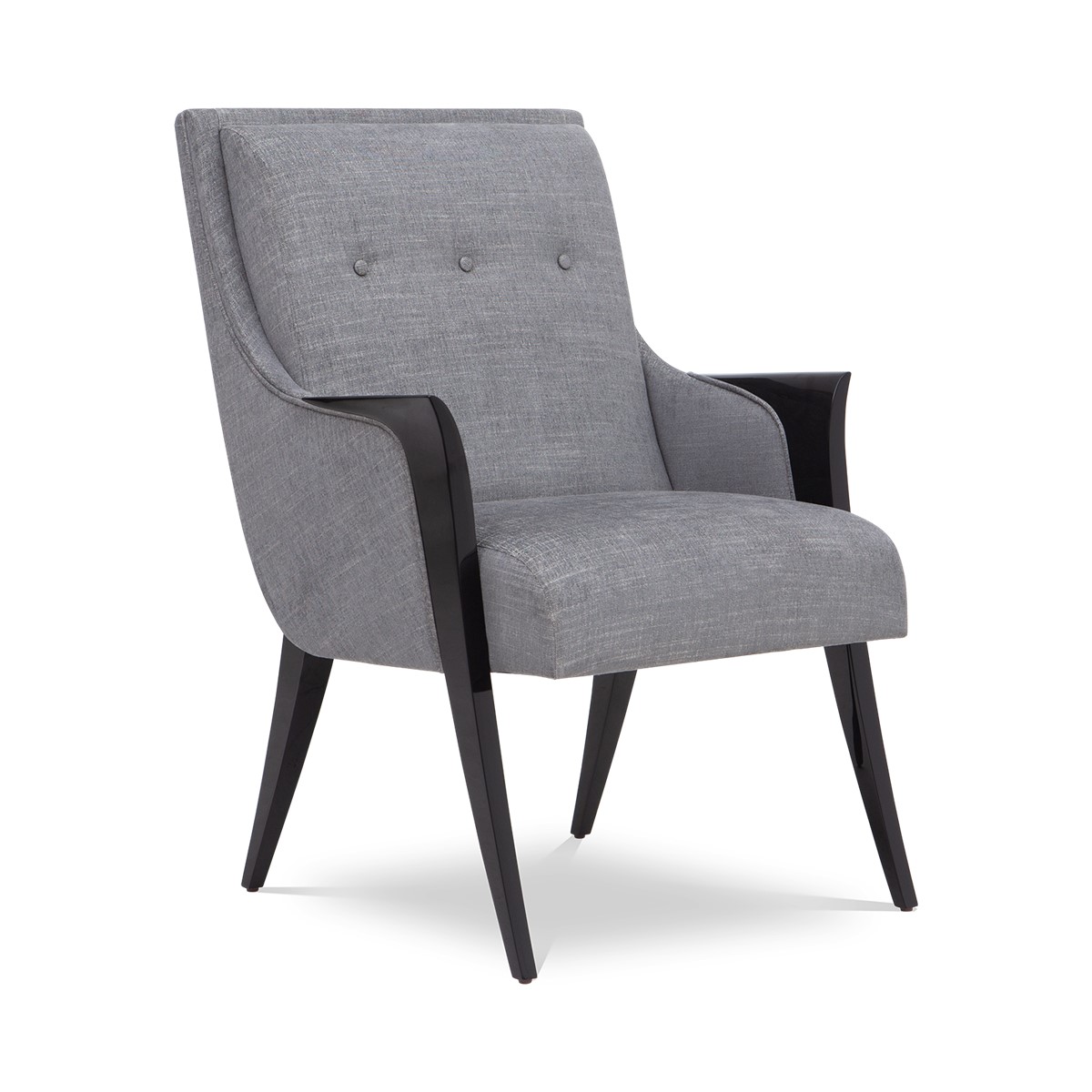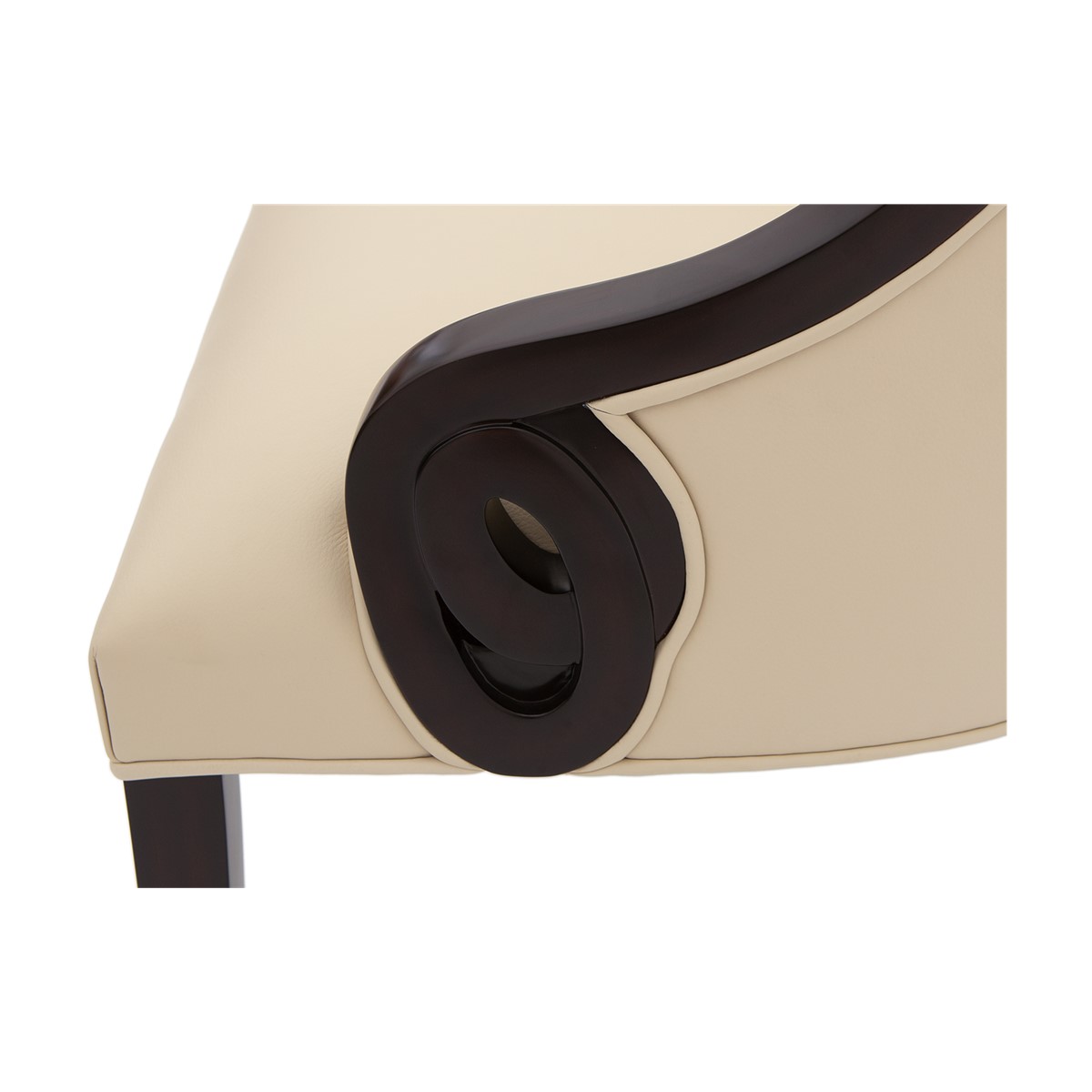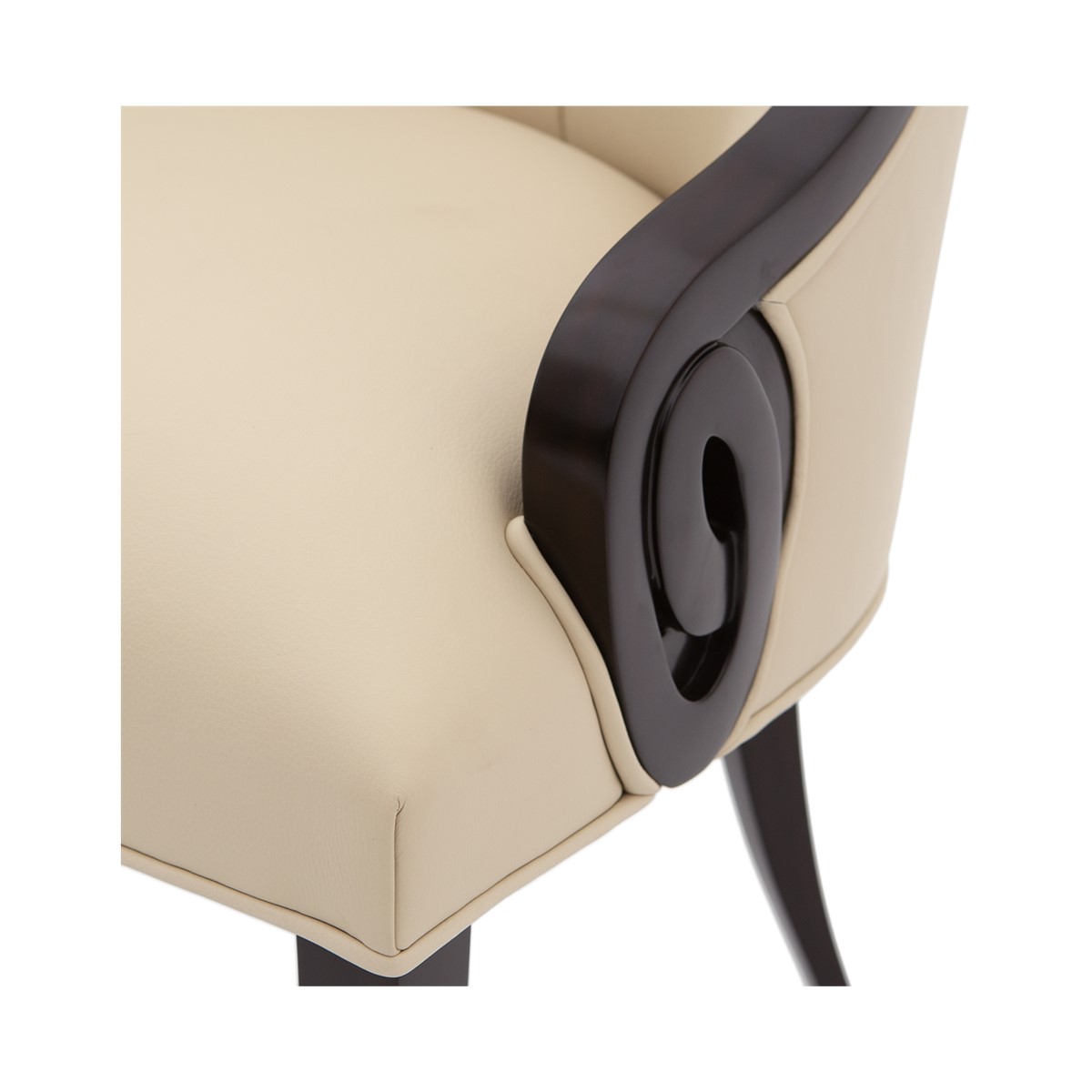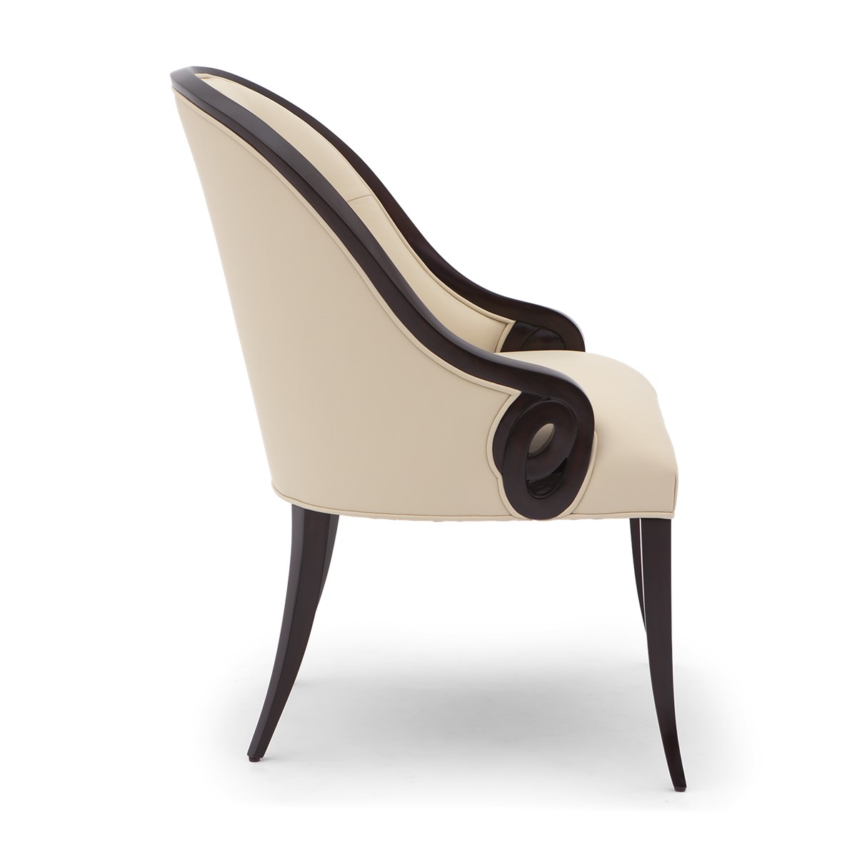 With a beautifully contoured back and tapered legs, this striking tufted salon chair is further enhanced by carved scroll detailing.