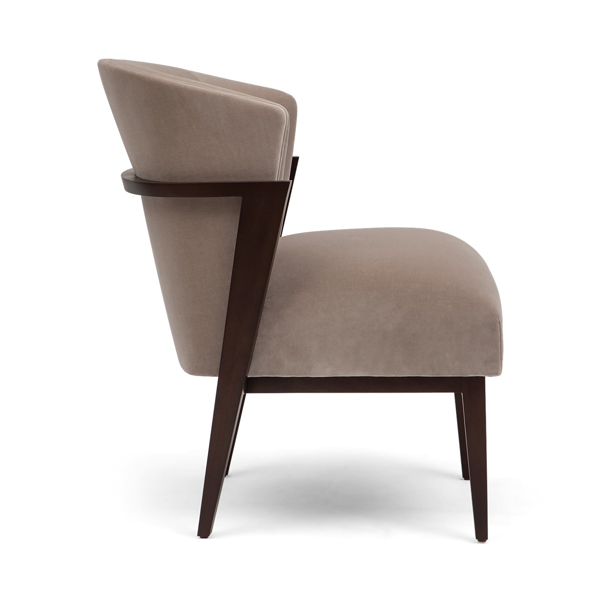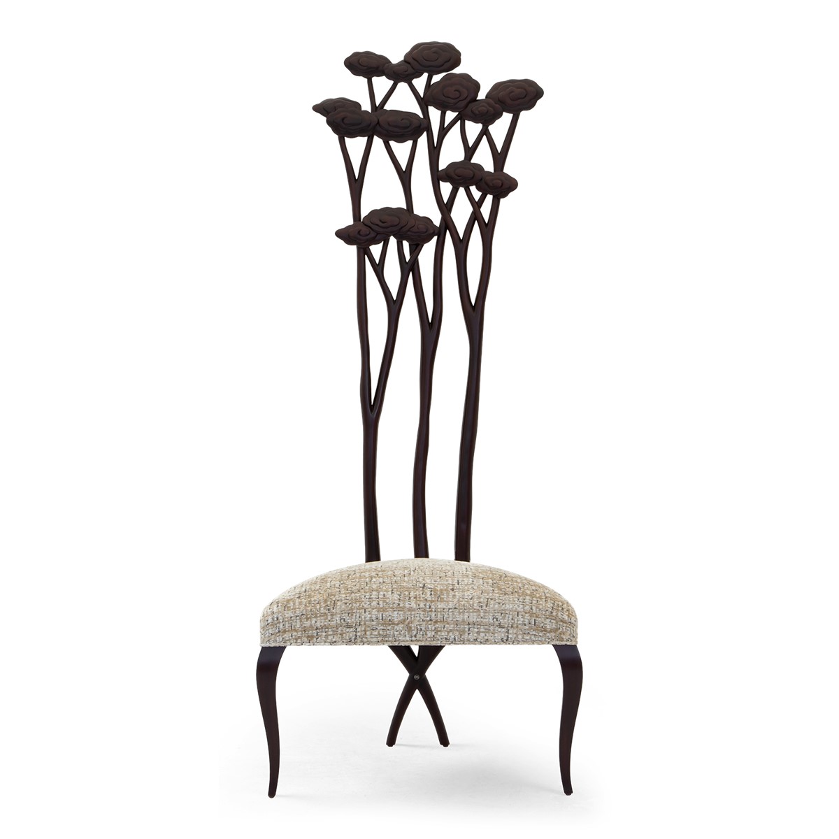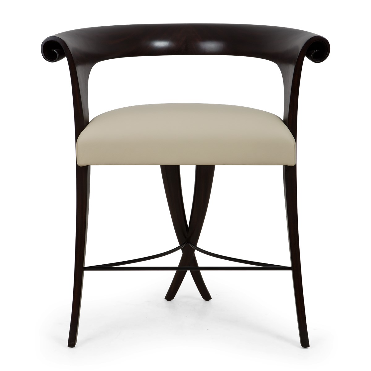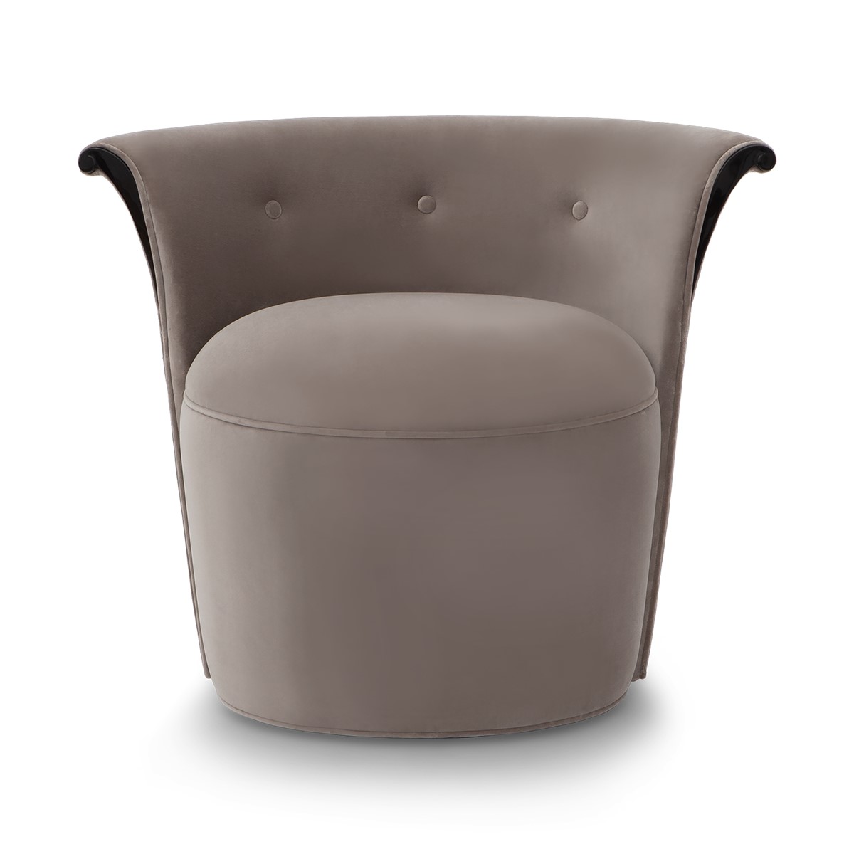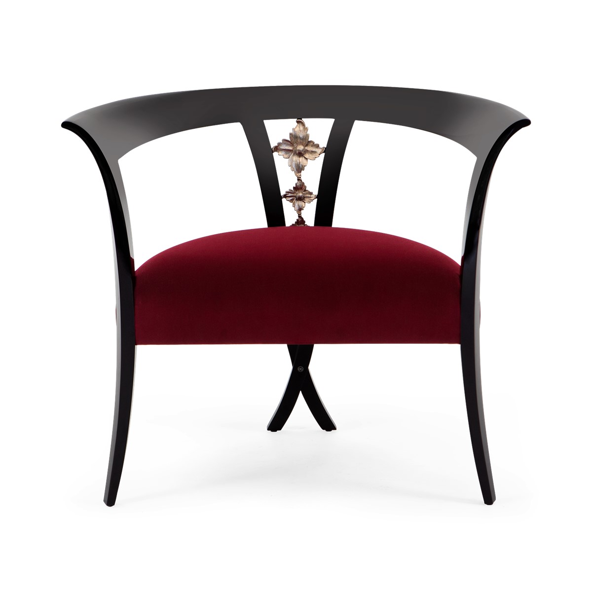 With a beautifully contoured back and tapered legs, this striking tufted salon chair is further enhanced by carved scroll detailing.