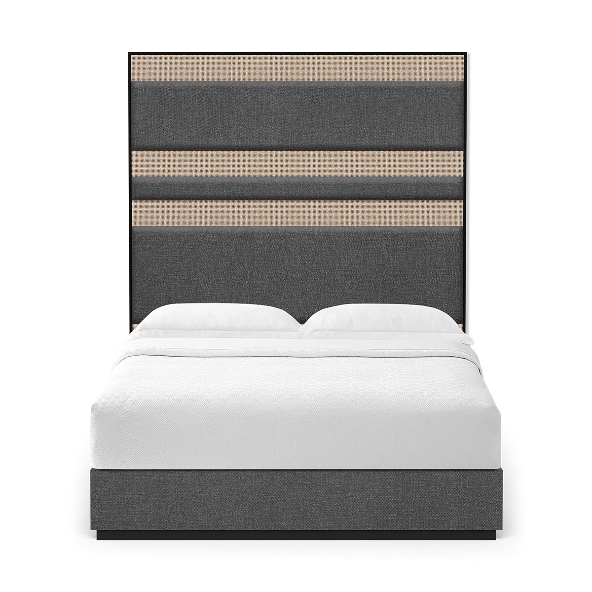 Contemporary bedroom settings are taken to the next level with this striking bed, characterized by a high geometric hand carved frame around a rectangular board upholstered with vertical seamlines, and a bed base with shallow squared feet.