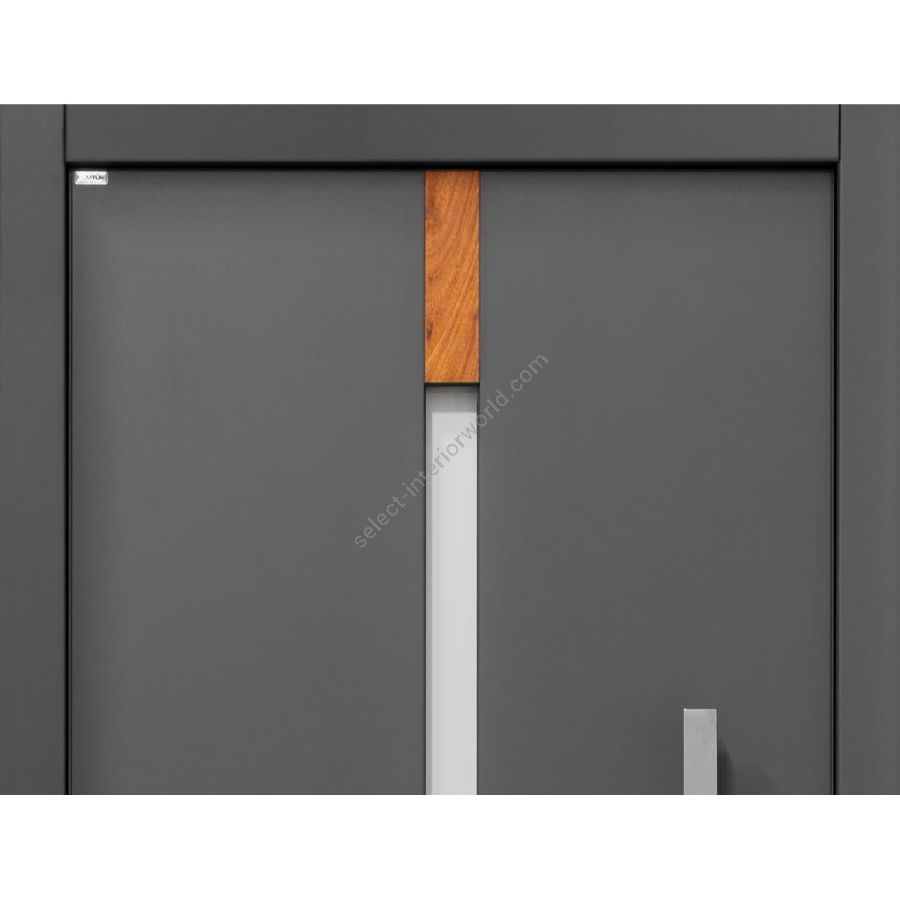 Eingangstür mit individuellem Lichtausschnitt eingerahmt durch Module aus Holz oder Edelstahl.