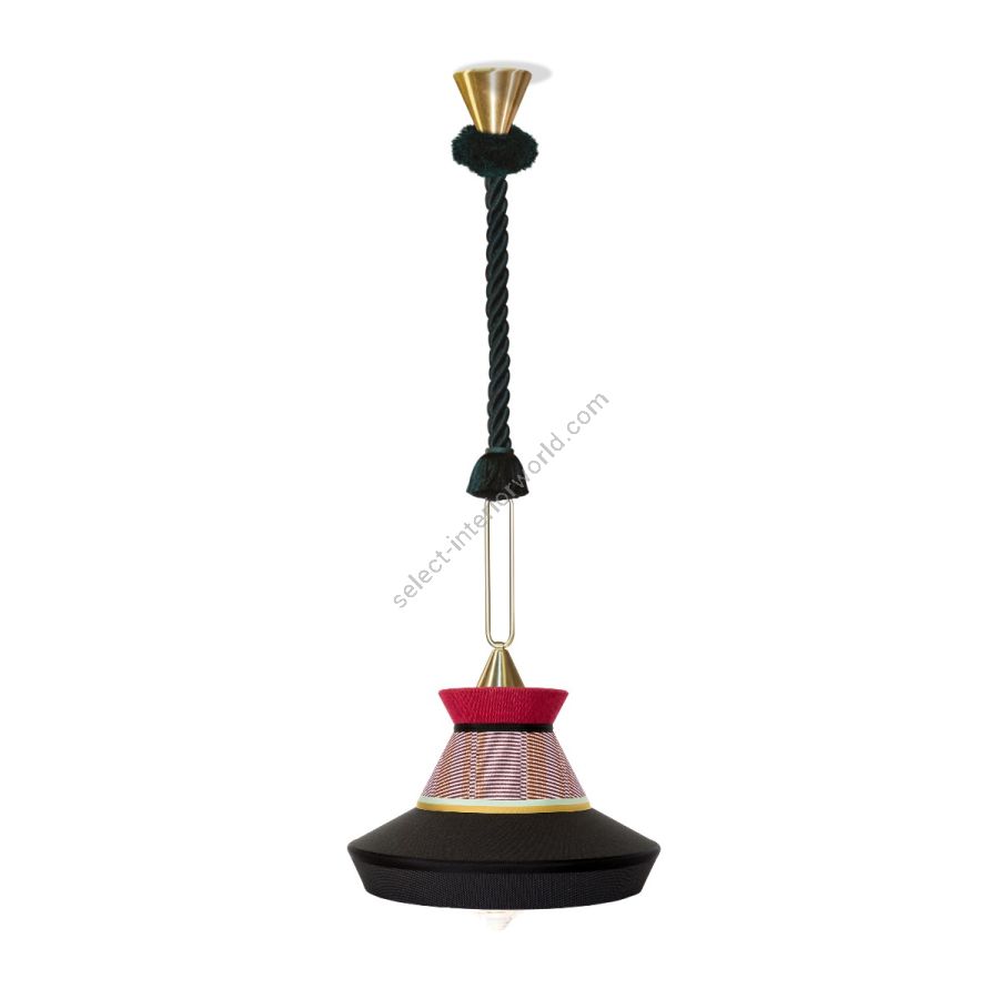 Calypso is a collection of suspension lights inspired by the art deco period, with fabrics whose textures and geometric patterns in black and white mixed with bright colours inspired by the South American and tropical culture, proves a very original result. The indoor version is characterized by a green braided silk cord. The support is a satin brass ring. The diffuser is in transparent glass.