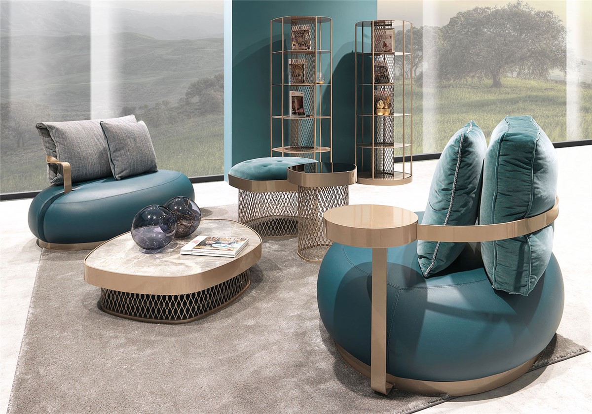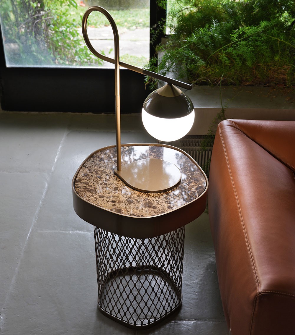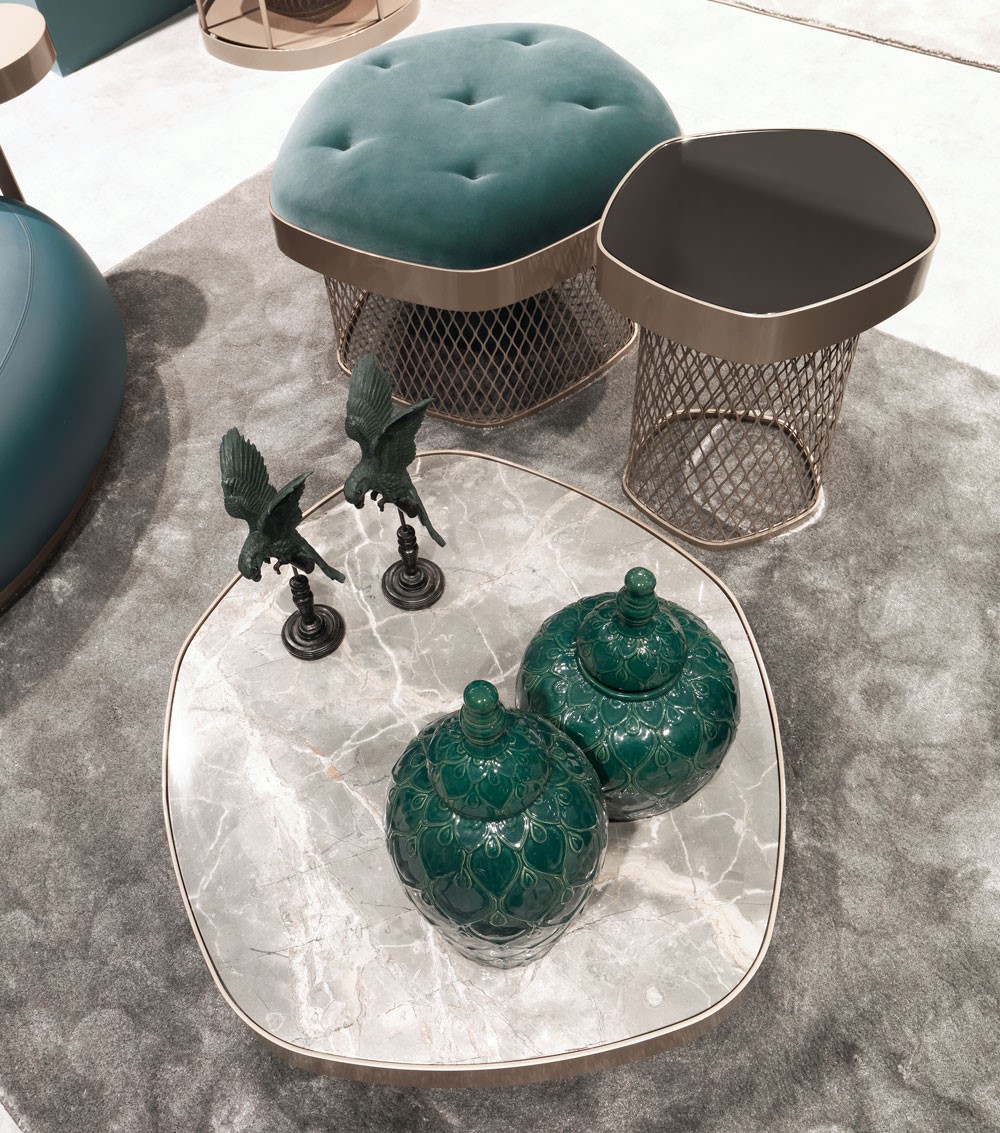 A new family of coffee tables and bookcase elements available in various sizes and heights to create unique and multifaceted compositions. The perforated structure symbol of the collection is reminiscent of a bracelet, which supports tops from the most diverse materials: marble, mirror, wood and even padded cushions, to transform the support into a seat. Asparagus is perfect presented in multiform compositions with marble top, mirror and padded cushion.