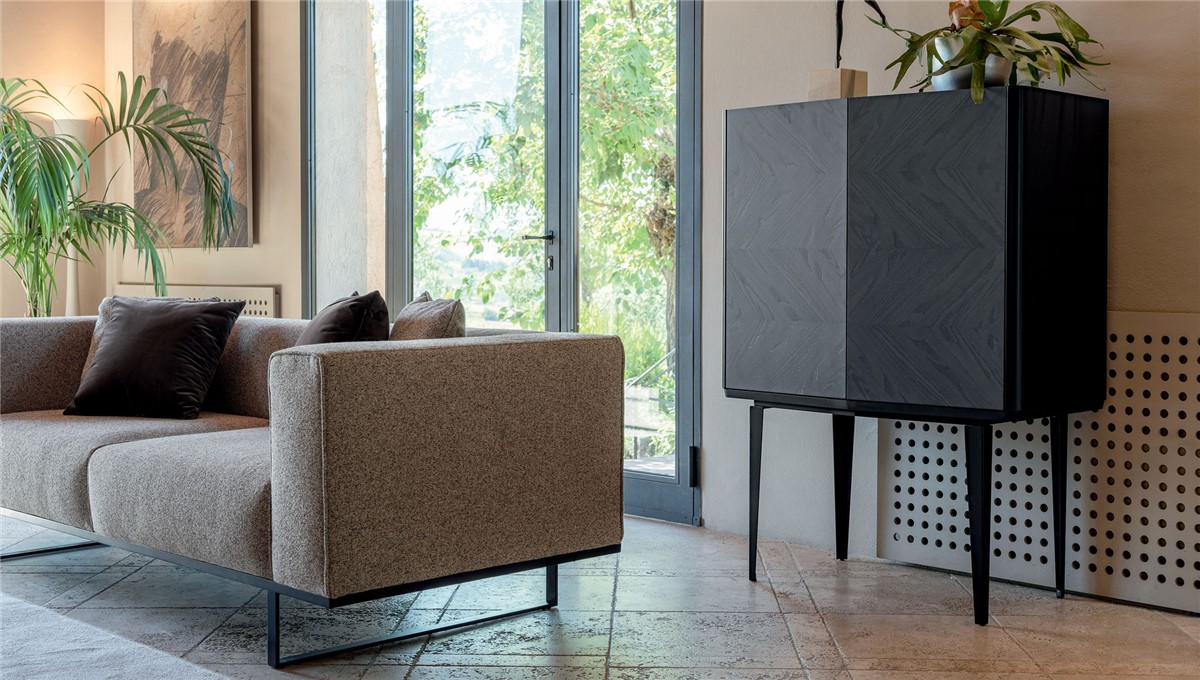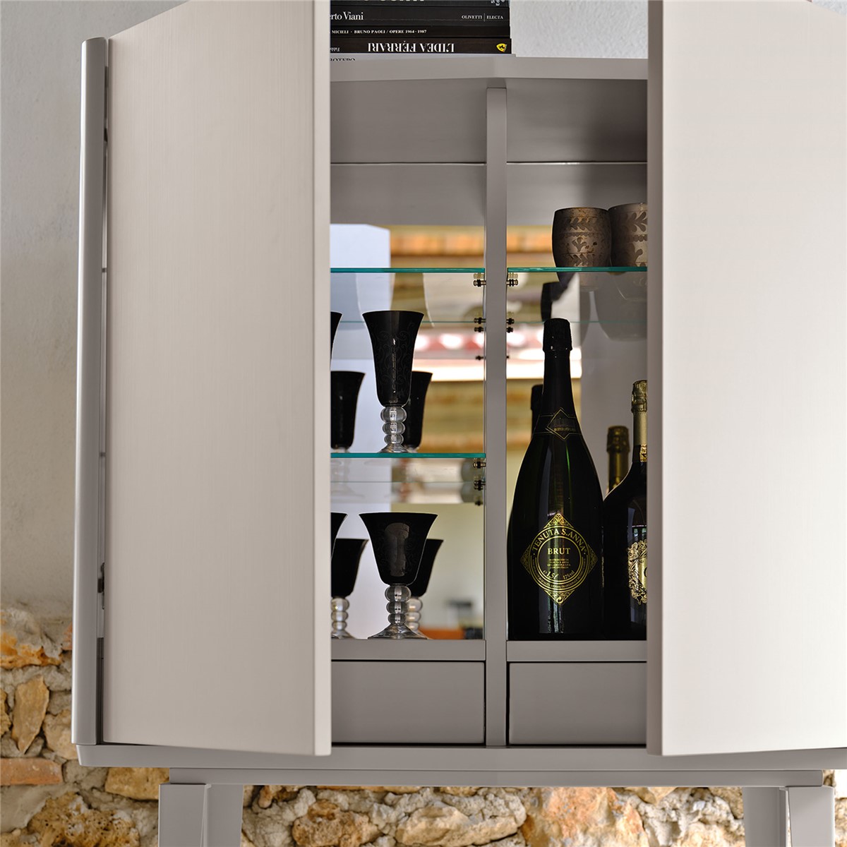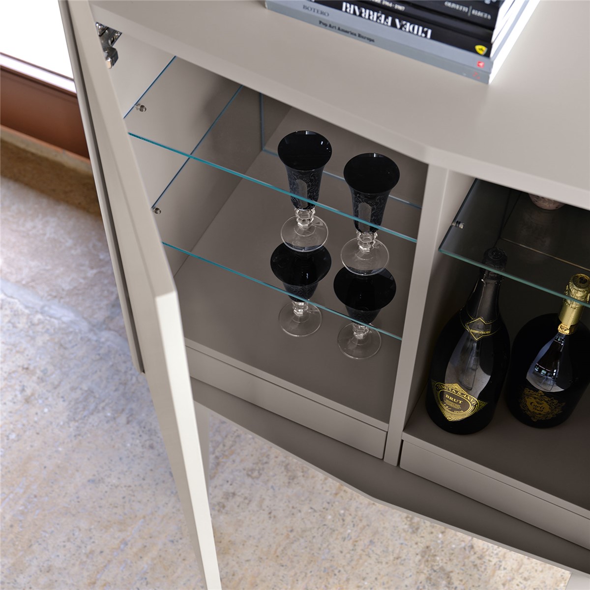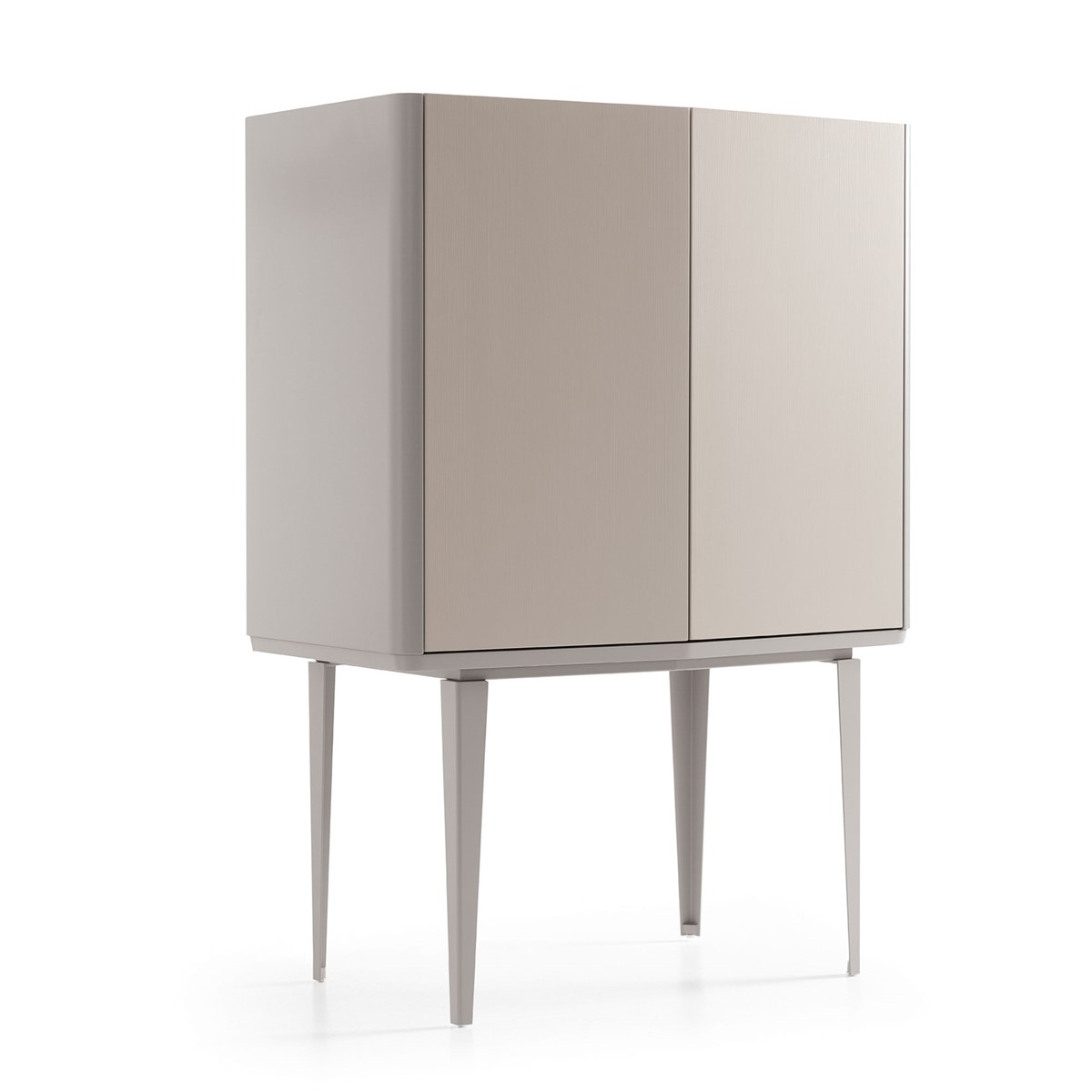 Bar cabinet with simple, strong lines that characterise the Denver collection. Graceful but effective colour contrasts enhance the dynamism of the shapes and the play of proportions. Available with lacquered or veneered doors in Canaletto walnut or inlaid ash .