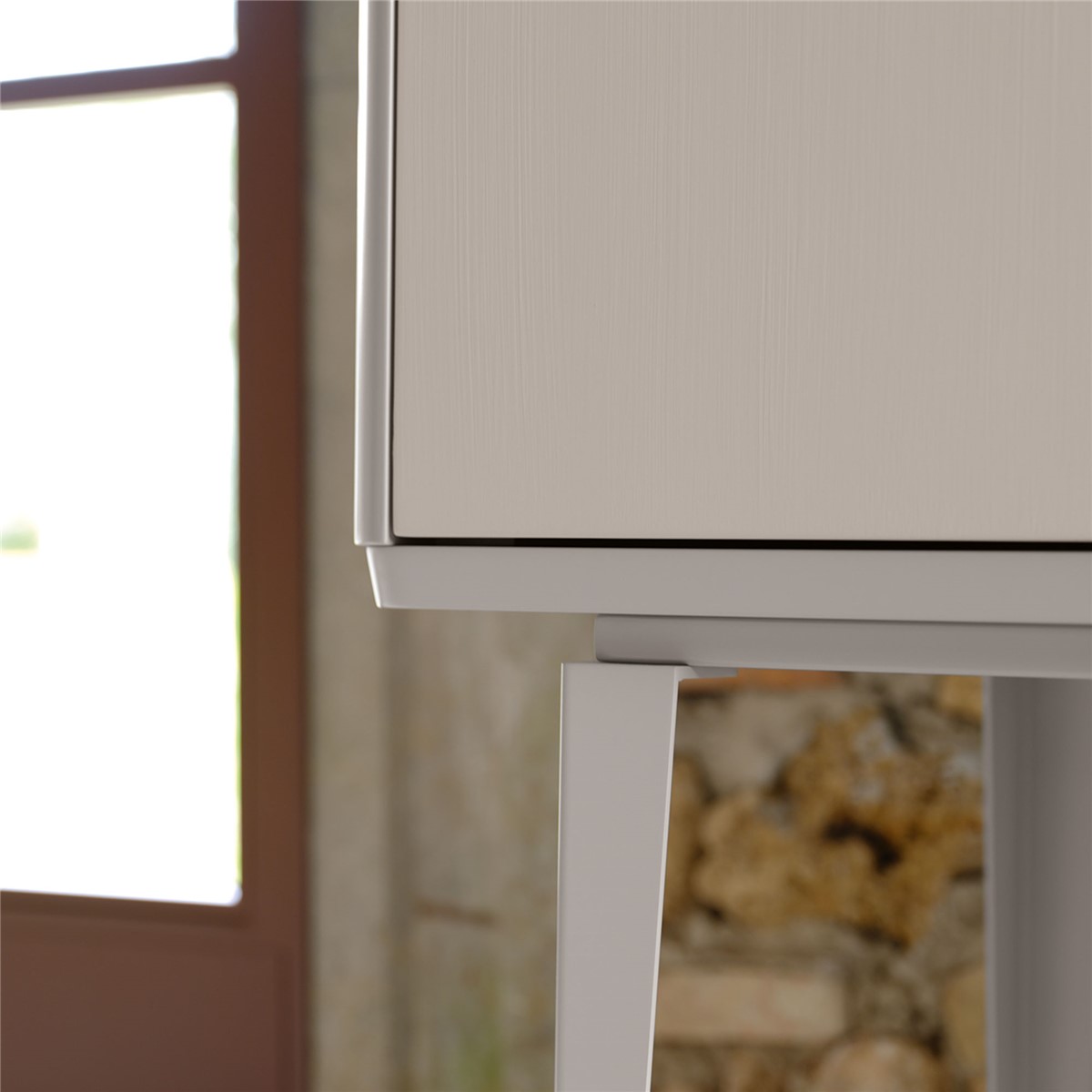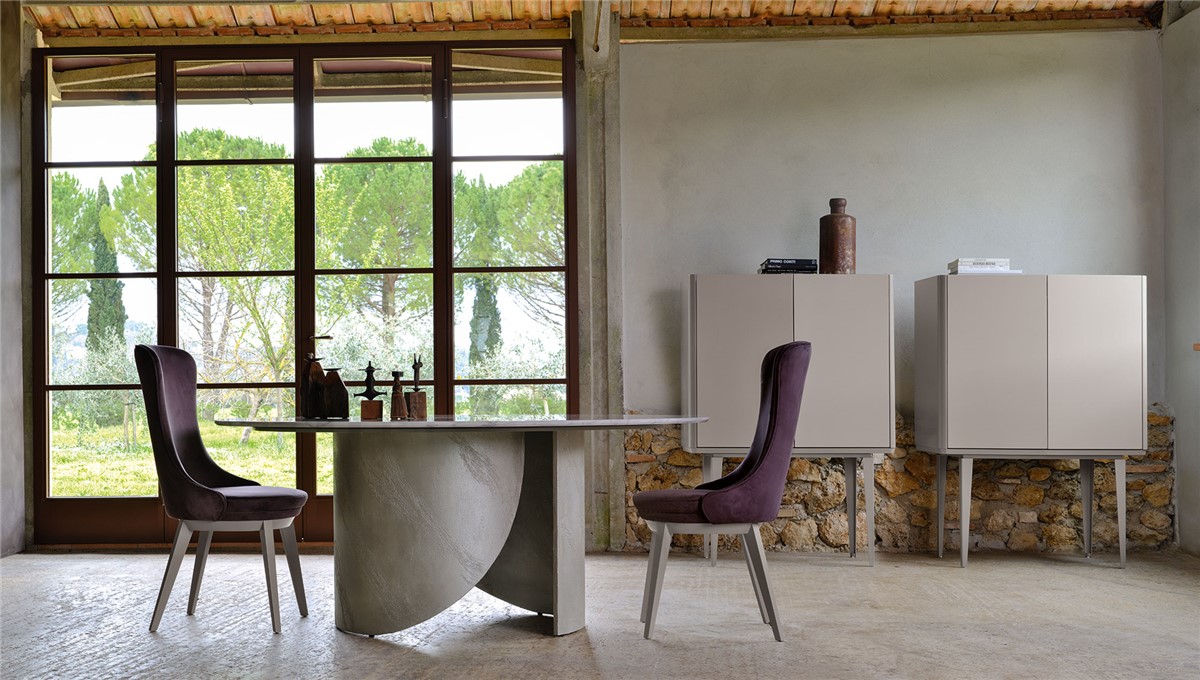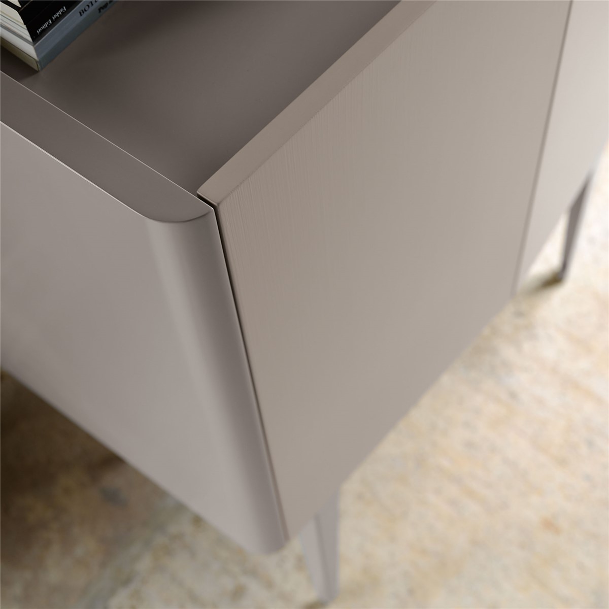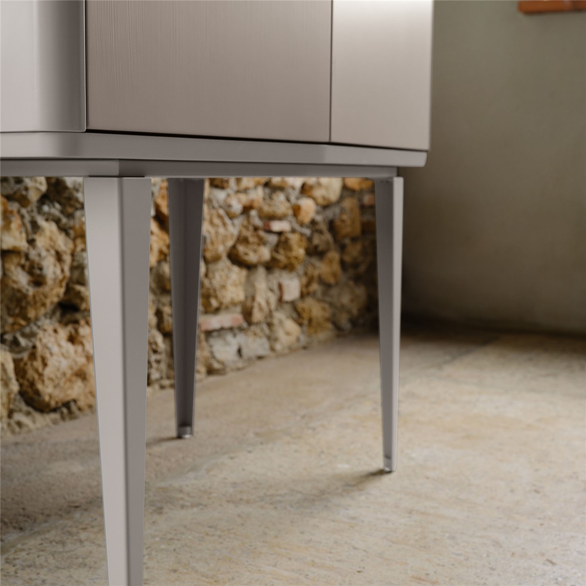 | Pantographed and lacquered mdf structure. Doors in poplar blockboard, lacquered, decorated or veneered, in Canaletto Walnut or in inlaid ash “Shadow” plywood. Birch plywood interior drawers push-pull opening. 8 mm thick glass shelves and back with mirror. Iron base and legs with adjustable feet. | |