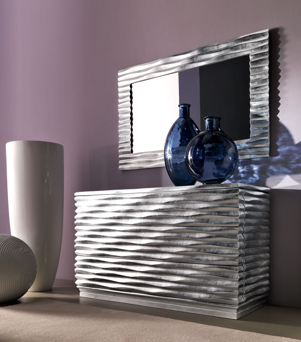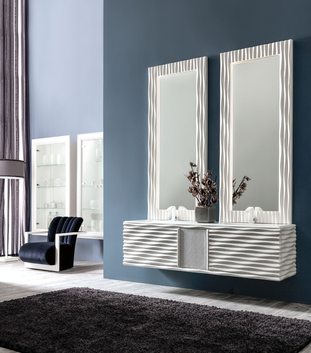 The wooden carved waves, distinguishing feature of Ebon collection, frame with grace this mirror, offering a gentle play of lights and shadows. Ebon can be realized in a wide range of finishings and different dimensions to customize every interior request.