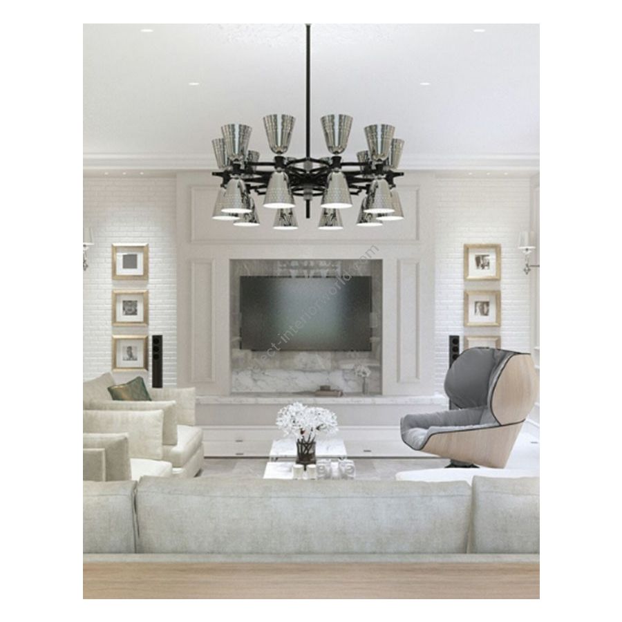 A revival of the mid-century modern design classics, Charles contemporary chandelier is a simple lighting design with a lot of character. It features 20 lampshades, all of them handmade in brass, with perforated details on the top. A copper plated finish is applied to the body of the lamp at the end of the process, creating a more contemporary vibe. The shades are lacquered a glossy black on the outside and a matte white on the inside, helping to create a more cozy light to the human eye. This copper pendant lighting can also be customized to have more shades, according to your needs. The right contemporary pendant light for a Scandinavian dining room, or a modern living room design.