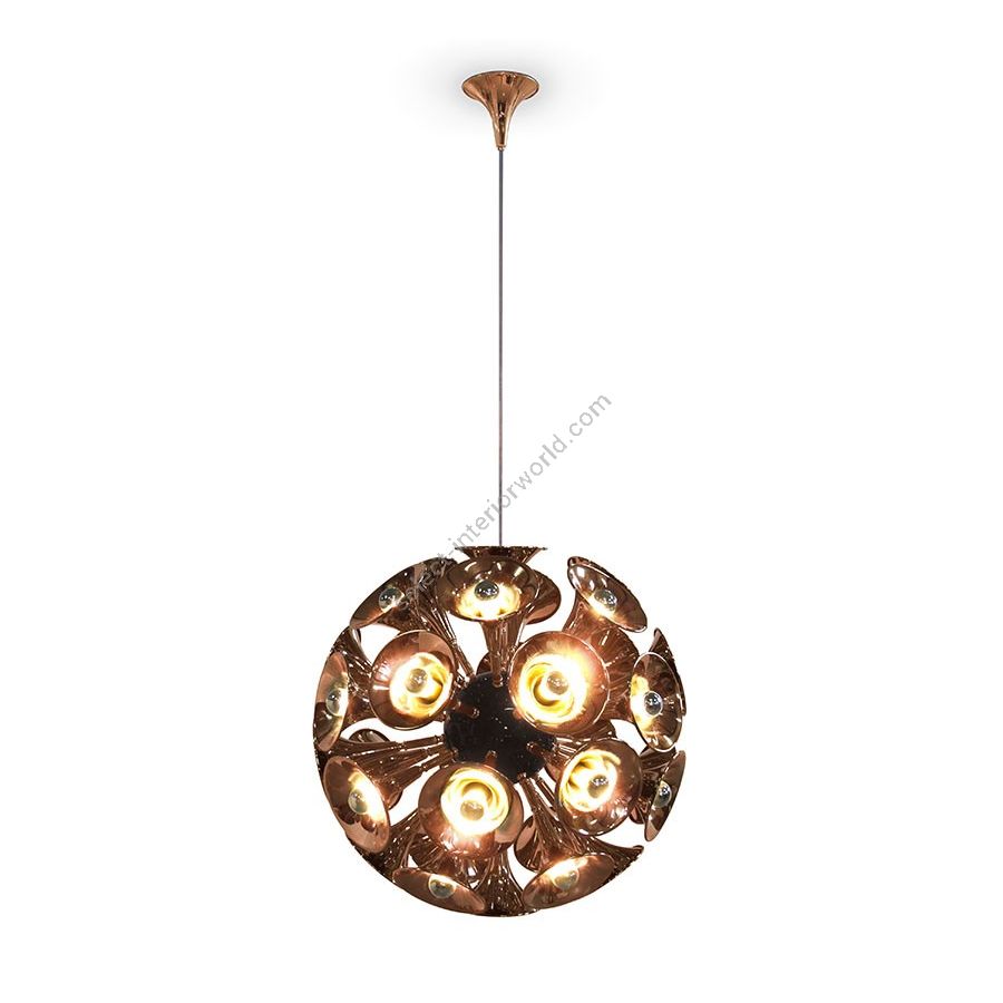 Inspired by the american trumpet player Chris Botti as a tribute to jazz music, Botti pendant lamp is a slightly smaller version of the modern chandelier with 15 trumpet-shaped shapes that stretch out from the center, creating a perfect sphere. It is handmade in brass, covered in a gold-plated finish. The round base at the center of the suspended light is handmade in aluminum and lacquered a glossy black, but it can also be lacquered a glossy white to meet the needs of the most exquisite sets. With a retro vibe, this art deco suspension lamp is best suited for a vintage living room, or mid-century modern bedroom.