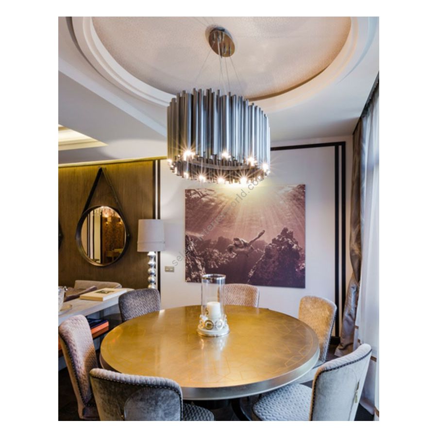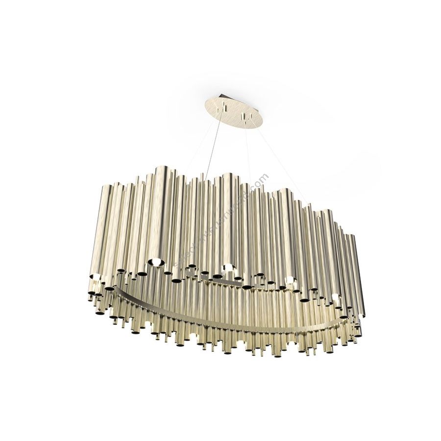 Brubeck mid-century modern chandelier is inspired by one of the foremost exponents of cool jazz: Dave Brubeck. This unique oval chandelier represents the sophistication and finesse of the American jazz pianist, displaying a very luxurious feeling. DelightFULL’s skilled artisans handmade this oval chandelier in brass, covering it with a gold-plated finish, which can be customized in multiple other finishes. The result of this outstanding creation is a functional dining room chandelier with sculptural shapes.