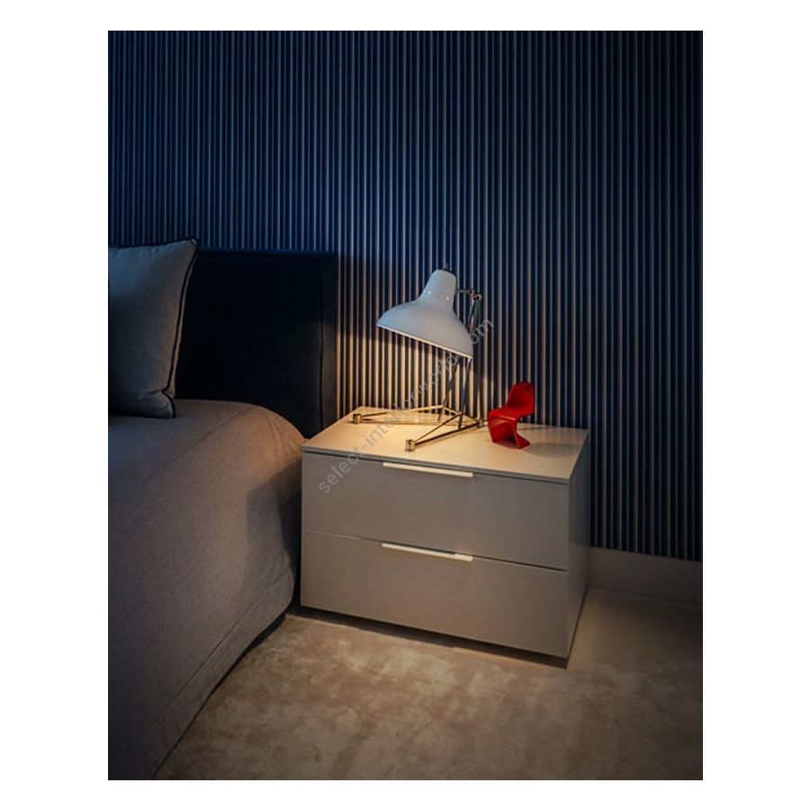 Diana is a vintage table lamp inspired by some of the greatest design classics of the mid-century era. It is a handmade lamp built with materials such as brass and aluminum. Brass was used on the body, whilst aluminum was chosen for the shade. The aluminum shade is lacquered a glossy red on the outside and matte white on the inside, while for the body a nickel-plated finish was chosen. However, both these colors and finishes can be customized according to your needs. This small lamp is easily the perfect reading light, having a movable and adjustable shade, that casts light to where it is needed. It best fits more minimalist or industrial environments. The perfect study table lamp.
