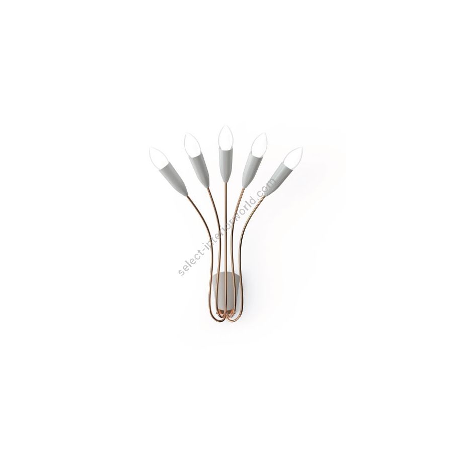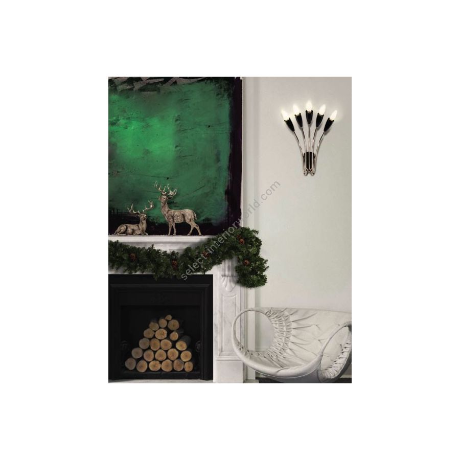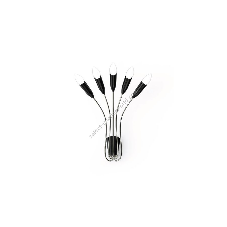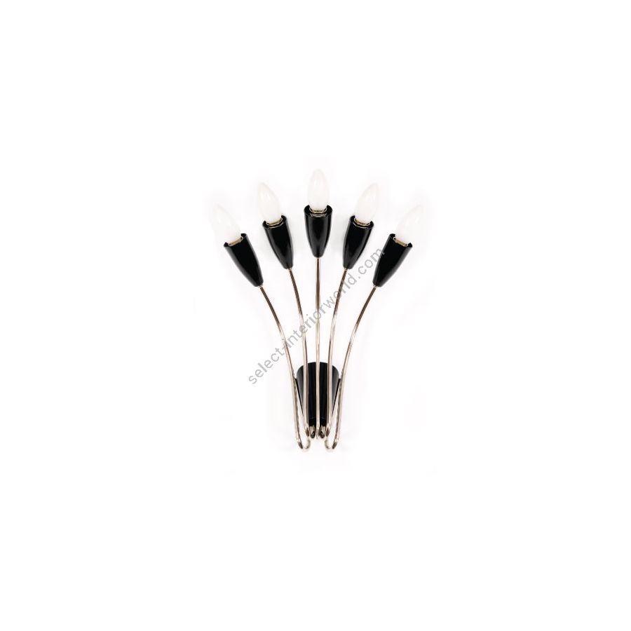 Due to its delicate and curved forms, Norah wall lamp has a vintage style that will transmit a sense of elegance and sophistication in every single space. This decorative wall light consists of five fixed arms made of brass with nickel plated and glossy black finishes. The wall lamp bulb holders are made in aluminum with a matte black finish. With five bulbs, this interior wall sconce includes E14 Bulbs (E12 for USA, not included). You can customize Norah with any RAL color of your choosing, in order to adapt this interior wall light to every room in your mid-century modern design. Going as high as 15.7 inches, Norah wall lamp will sit beautifully next to a piece of art in your living room decor.