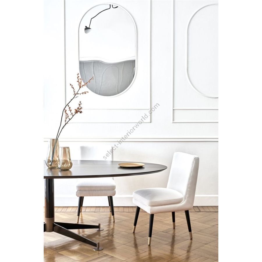 Unser Diana-Esszimmerstuhl hat einen raffinierten Stil, der vom Dekor der 1950er Jahre inspiriert ist. Diana kann nicht nur für den Essbereich, sondern auch als Akzentstück im Eingangsbereich oder als Schreibtischstuhl im Arbeitszimmer verwendet werden. Seine elegante und feminine Form besteht aus Holz mit schlanken und abgewinkelten Beinen, die mit Glanz- oder Mattlack veredelt und mit Metallspitzen aus glänzendem Messing, satiniertem Messing, glänzendem Chrom oder Bronze verziert sind. Der obere Teil des Stuhls verfügt über eine gepolsterte Rückenlehne und ein zusätzliches Kissen auf der Sitzfläche, wodurch ein ausgewogenes und komfortables Design entsteht.