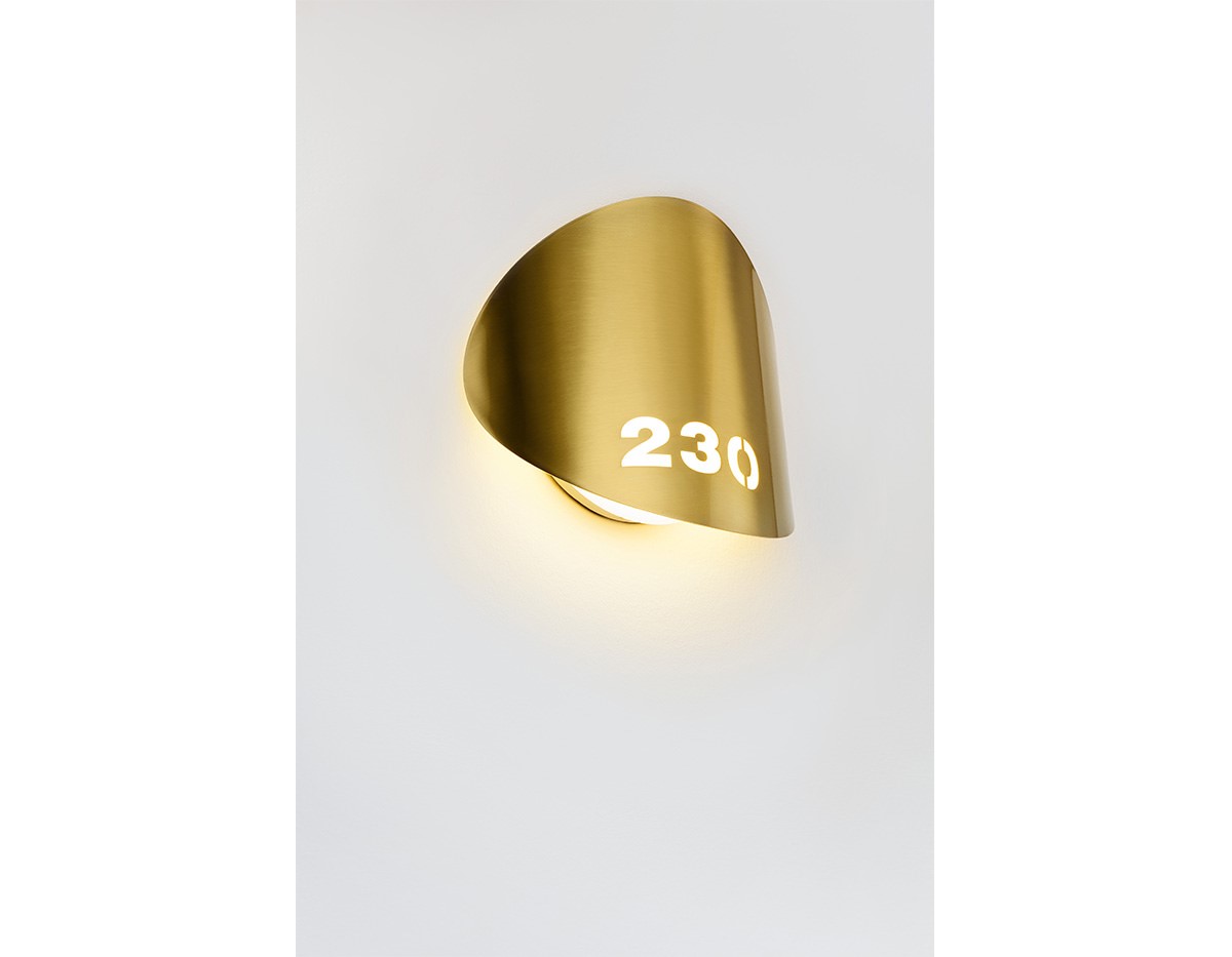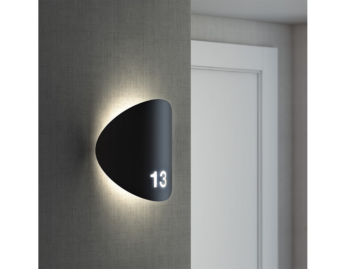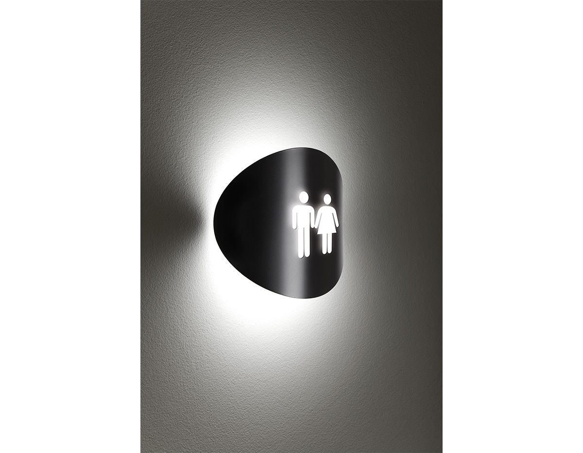 Metal wall lamp suitable for indoor and outdoor with an interior shade made of polyethylene and integrated dimmable LED. The curved metal front plate allows laser-cut signage with custom creations including ideograms, logos and texts.