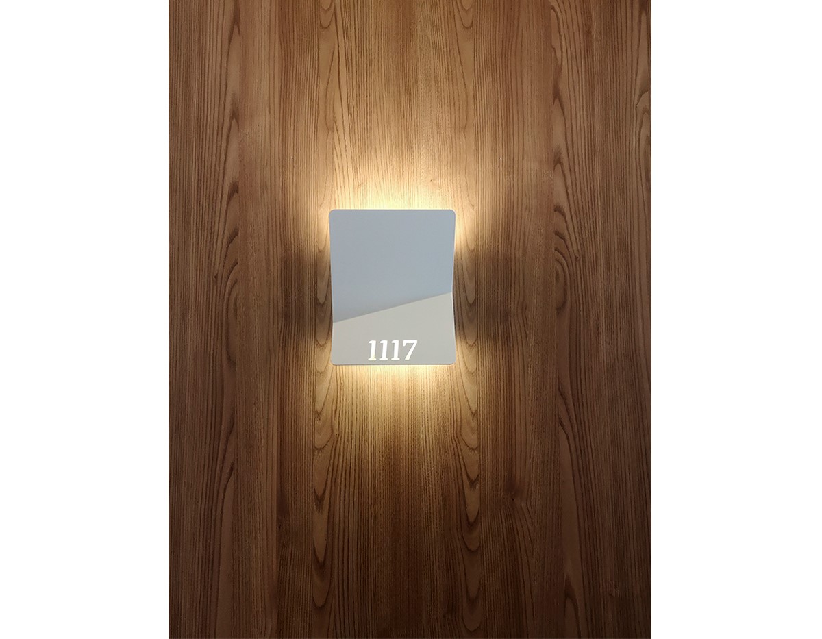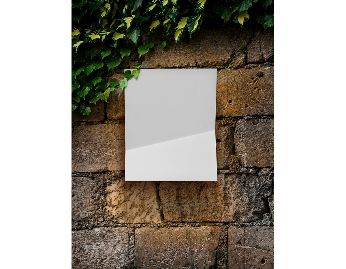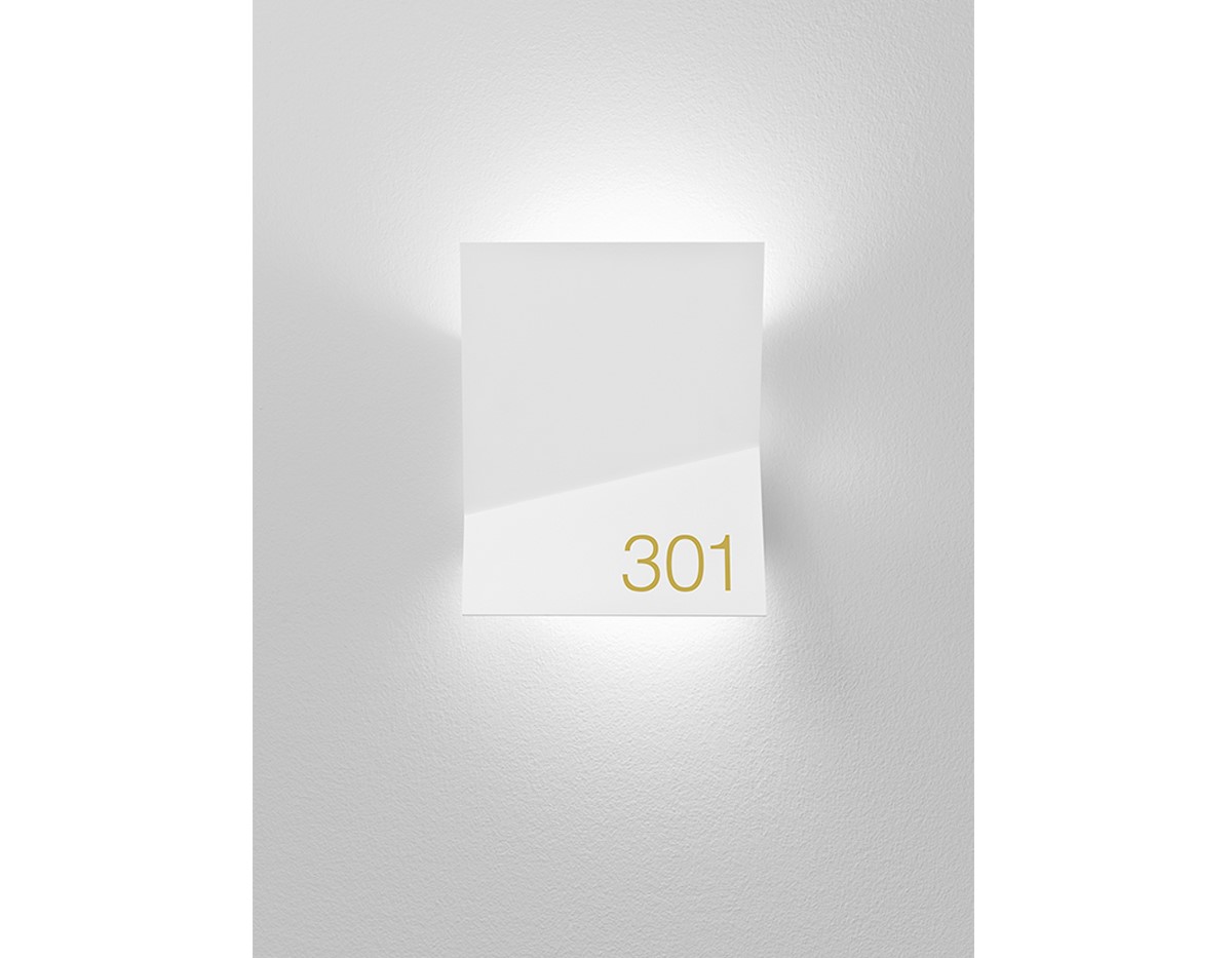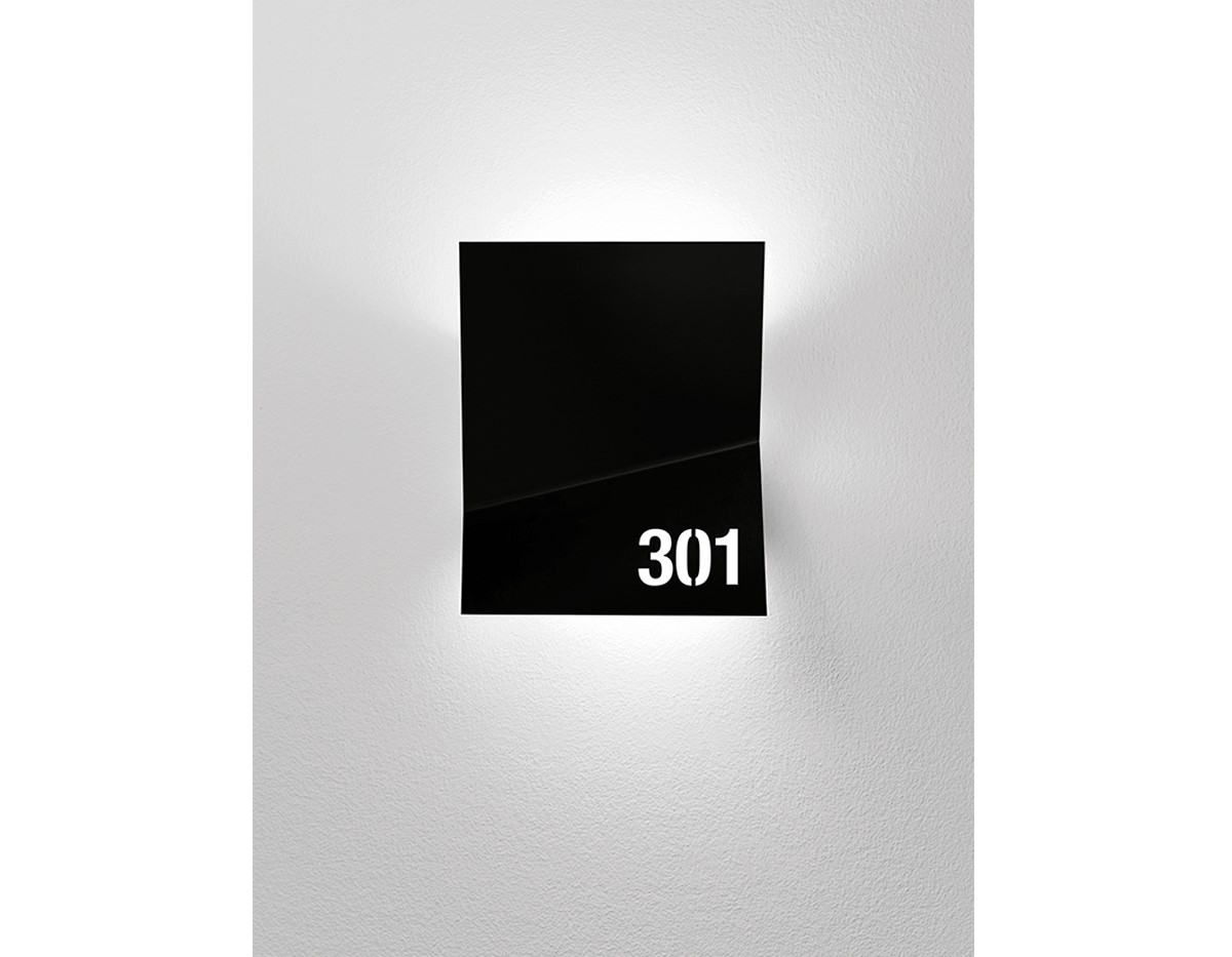 Metal wall lamps suitable for indoor and outdoor with integrated dimmable LED. The front plate allows laser-cut signage with custom creations including ideograms, logos and texts.