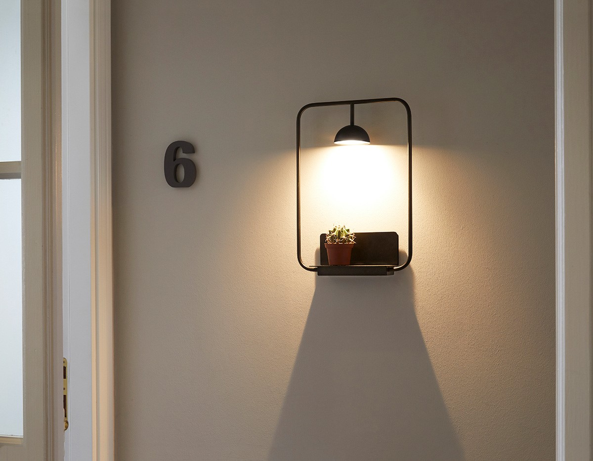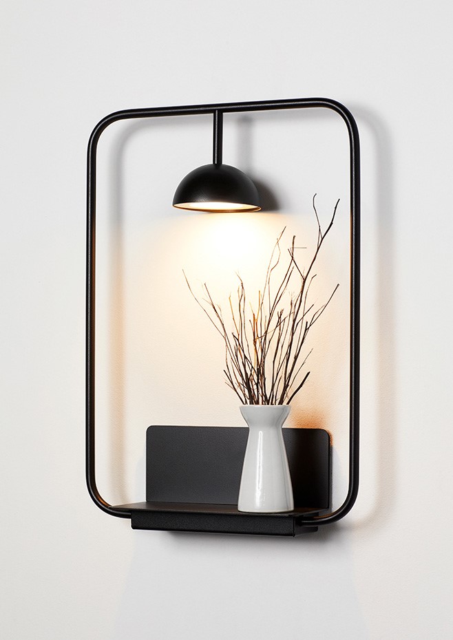 Wall light with a rounded edged-rectangular body. Head with dome shade and integrated LED. It has a shelf that holds up to 2 kg of weight. Apply ideal for halls, hallways and bedside tables.