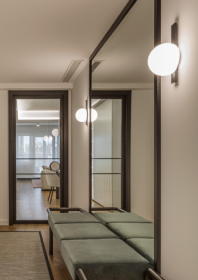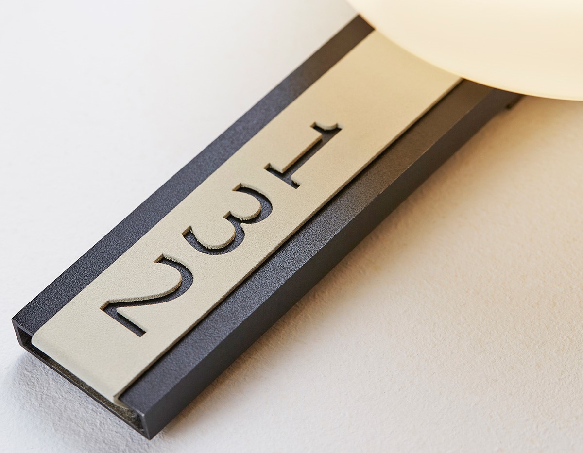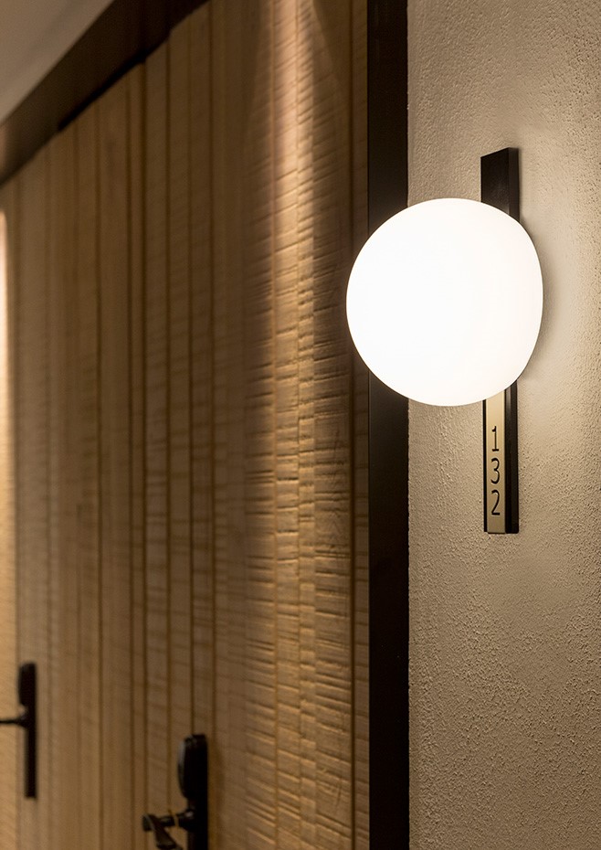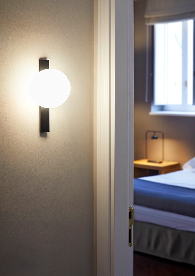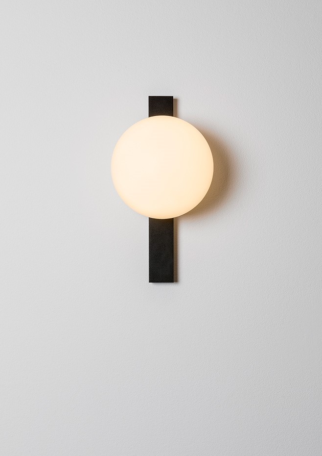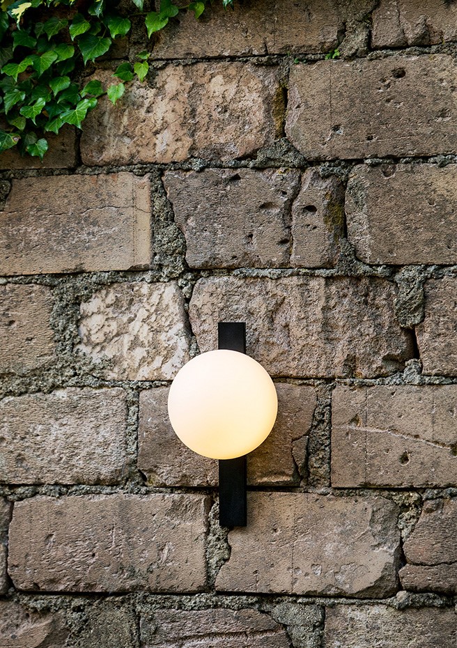 Metallic wall lamp providing direct and indirect light. A-3720: Indoor locations, it is made of opal glass and a decorative metal bar. Available in black and satin gold finishes. A-3720X: Outdoor locations, it is made of translucent beige polyethylene and a decorative metal bar. Available in black and rust finish. Ideal for the bedroom, corridor, garden, terrace, bathroom, spa, hotel, retail shop and restaurant.