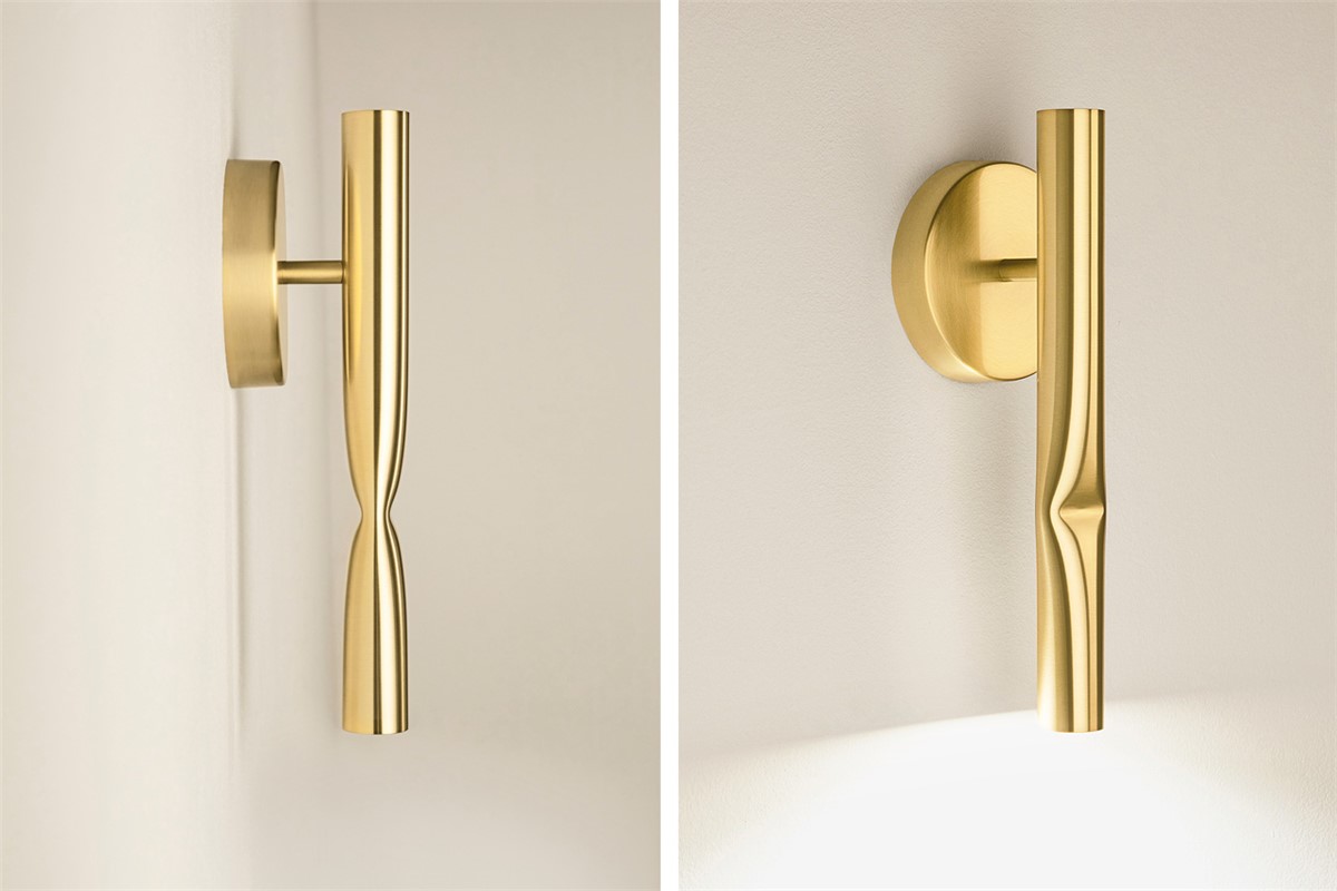 Metallic wall lamp made with a metal tube smashed in the middle and an acrylic lens and integrated LED light facing up or facing down.