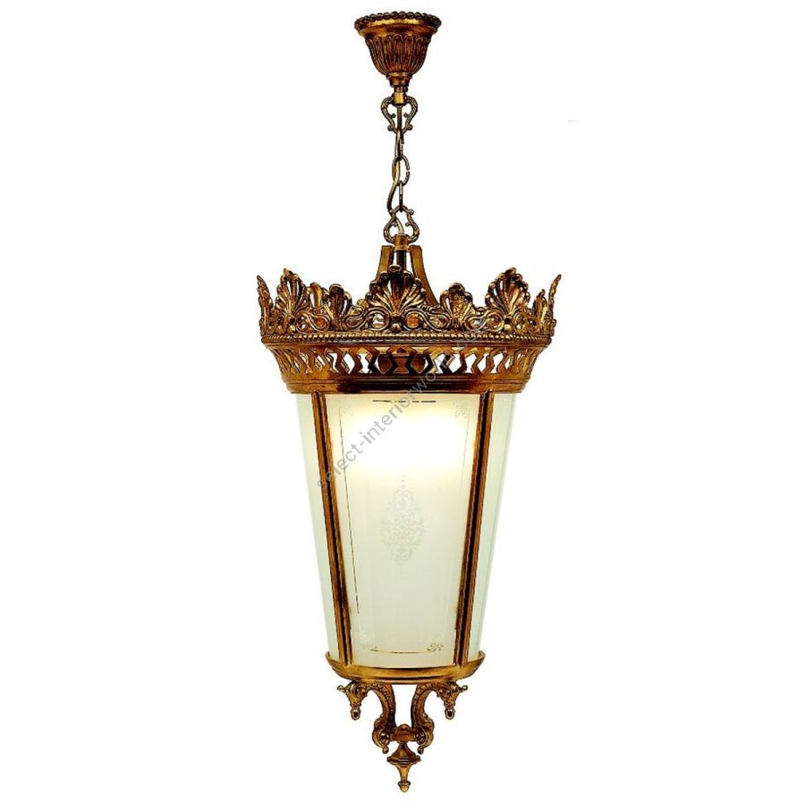 Hängende Laterne aus gegossenem Messing im Alter, handdekorierte und verzierte sandgestrahlte Gläser.