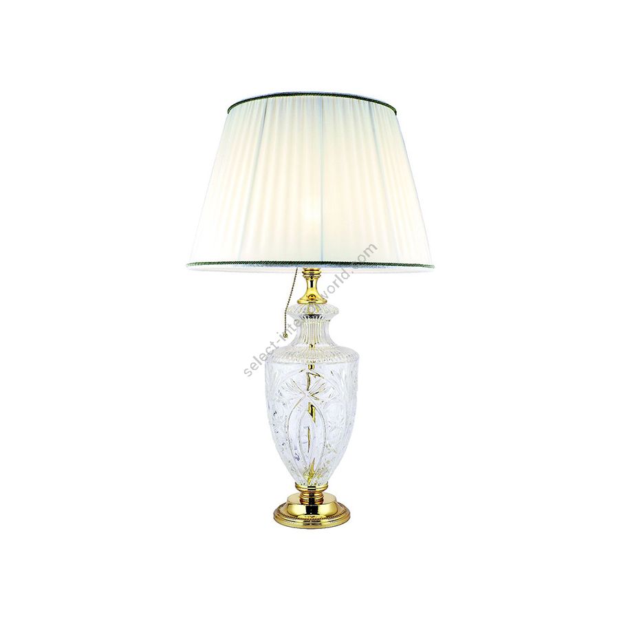 Tischlampe aus Kristall mit Details aus poliertem Messing und Lampenschirm aus Stoff.