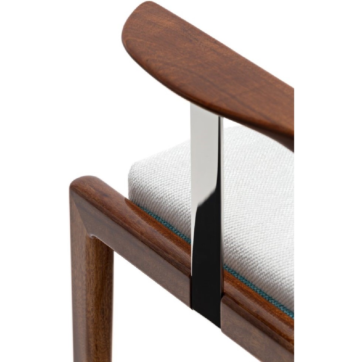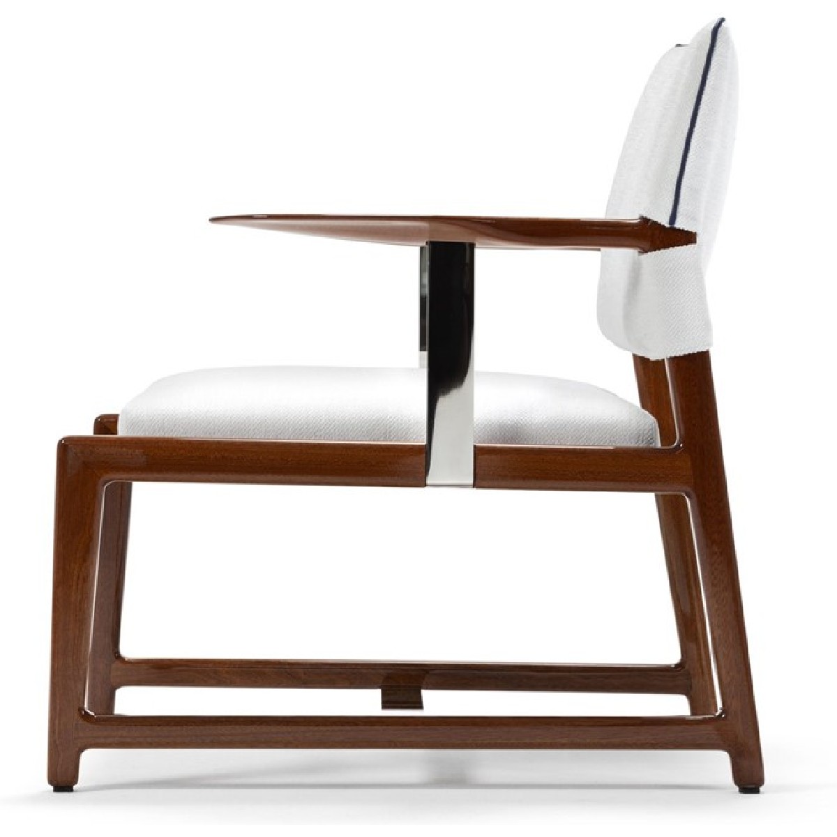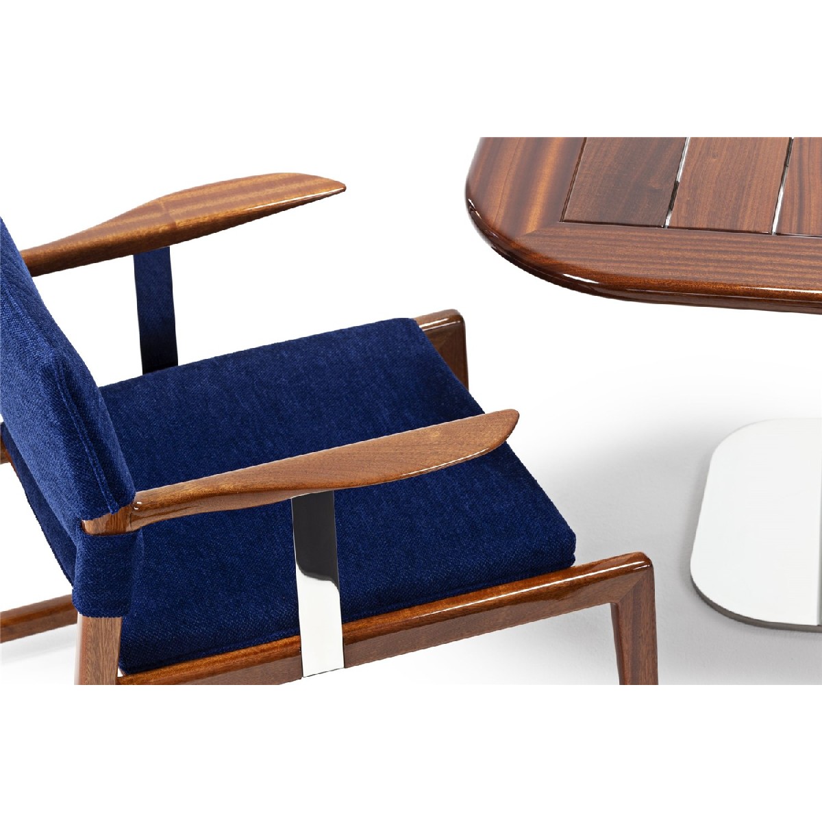 Realizzata in acciaio inox e pregiato legno di mogano, la poltrona incarna l’incontro tra resistenza nautica ed eleganza senza tempo. Il contrasto tra il calore del legno e la purezza del metallo esalta un design fondato sulla durabilità, la precisione e l’armonia materica.