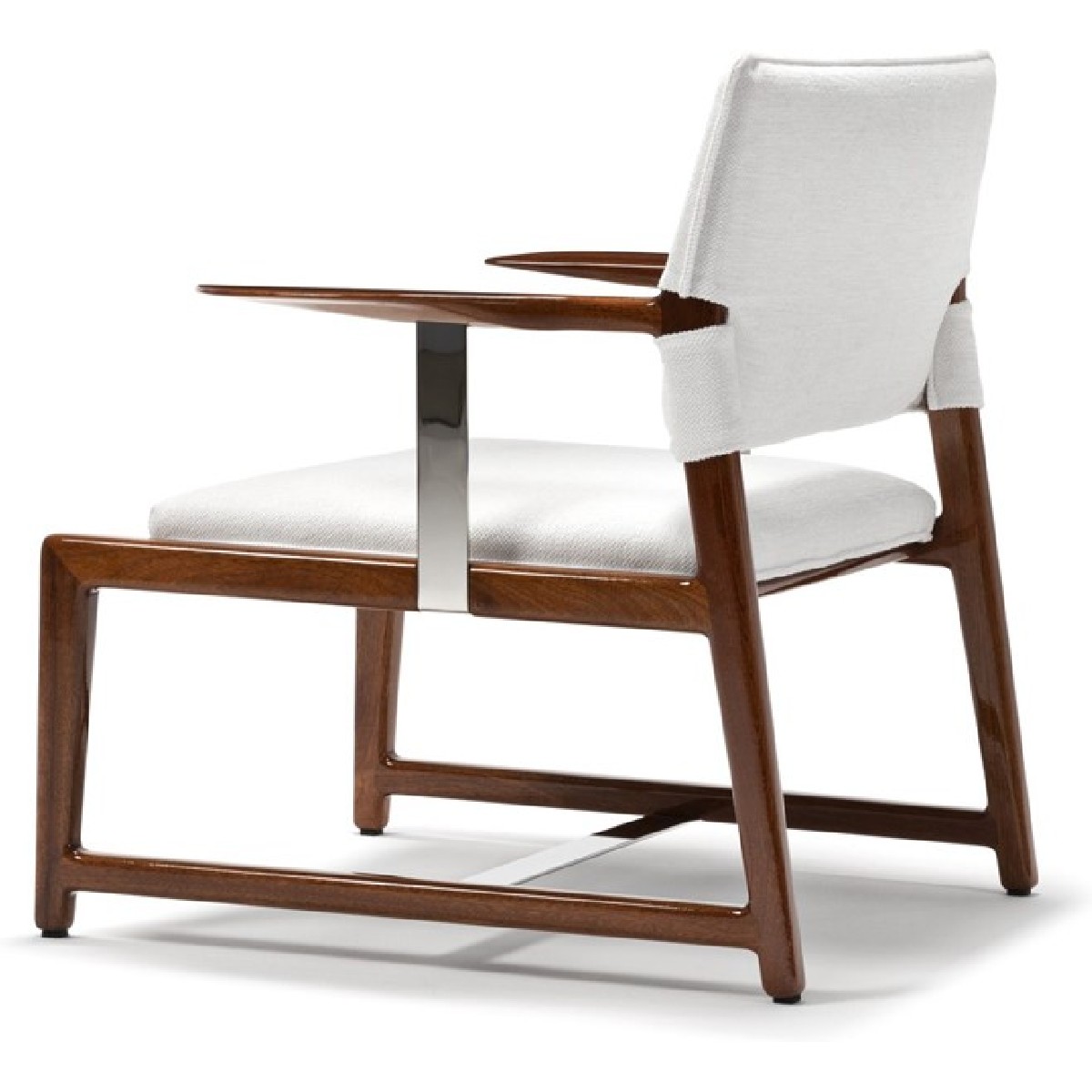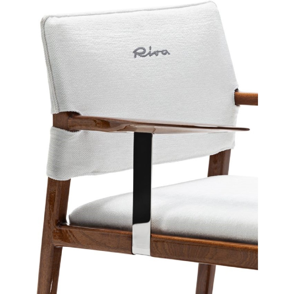 La poltrona nasce dalla sinergia tra due eccellenze italiane accomunate da una visione progettuale che valorizza il mogano come materiale iconico. Lavorato con meticolosa cura artigianale, il legno viene rifinito a mano per esaltarne le qualità naturali ed è disponibile anche in una raffinata finitura lucida, omaggio all’estetica nautica di Riva.