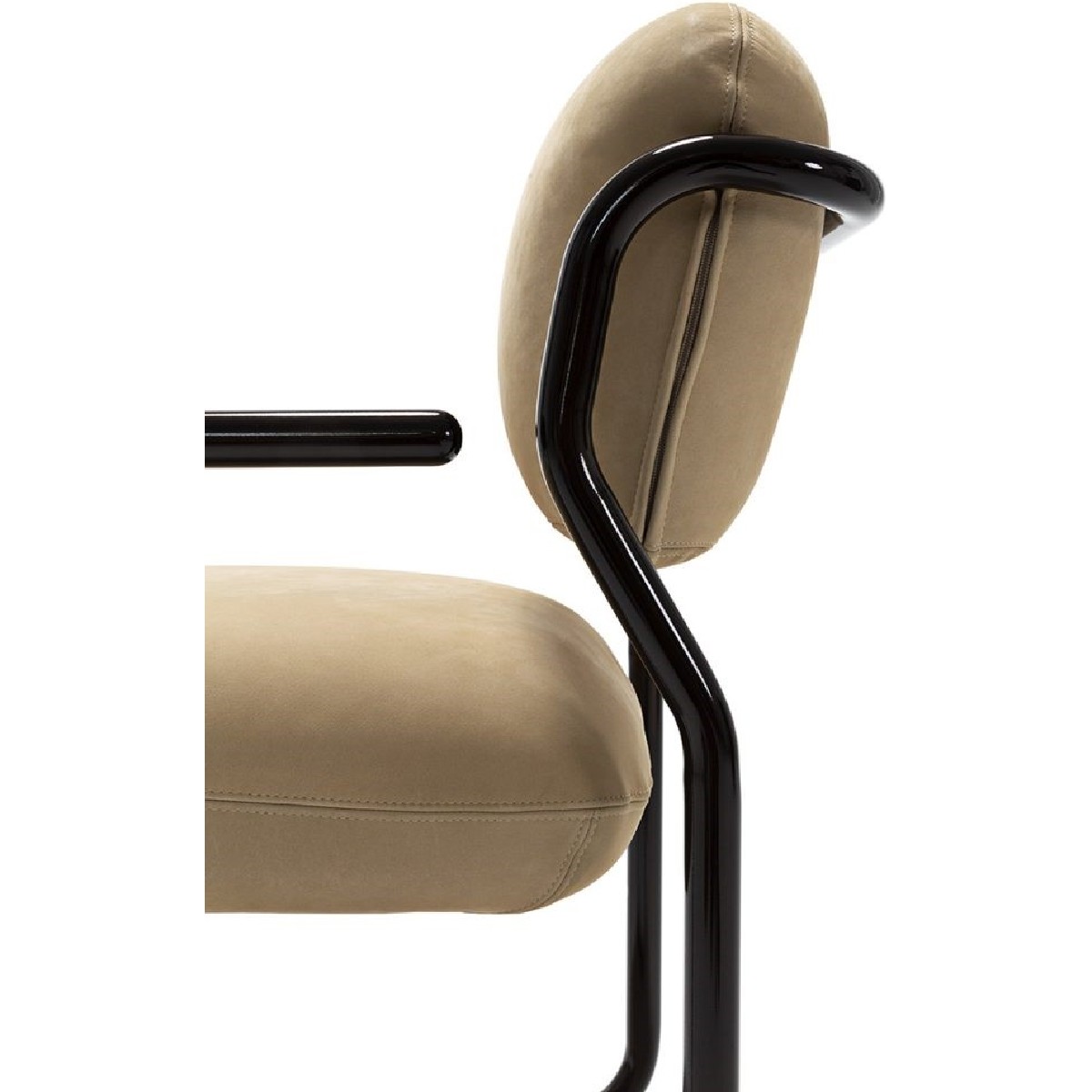 La poltrona Modernista presenta una struttura audace in acciaio inox, sapientemente modellata per sostenere volumi imbottiti e generosi. I cuscini morbido creano un raffinato contrasto con il profilo metallico curvo, dando vita a un equilibrio perfetto tra forza industriale e comfort sofisticato.