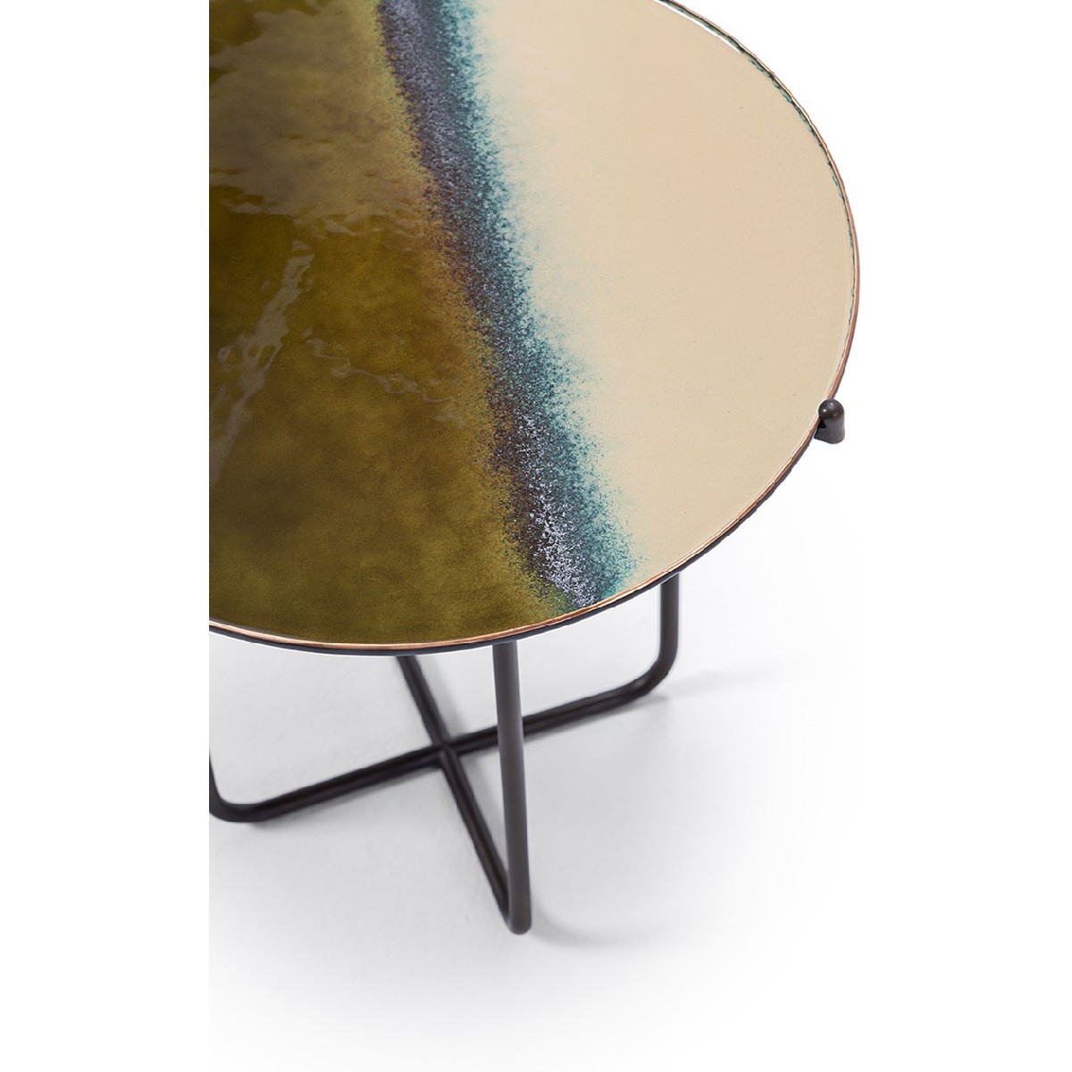 Il tavolino Astratto è il risultato di un processo artigianale accurato, in cui il rame viene modellato e smaltato a mano con grande perizia. Ogni superficie riflette l’unicità della lavorazione, con sfumature e irregolarità che testimoniano l’intervento umano. Un oggetto che celebra la materia e la mano che la trasforma, fondendo tecnica tradizionale e sensibilità contemporanea.