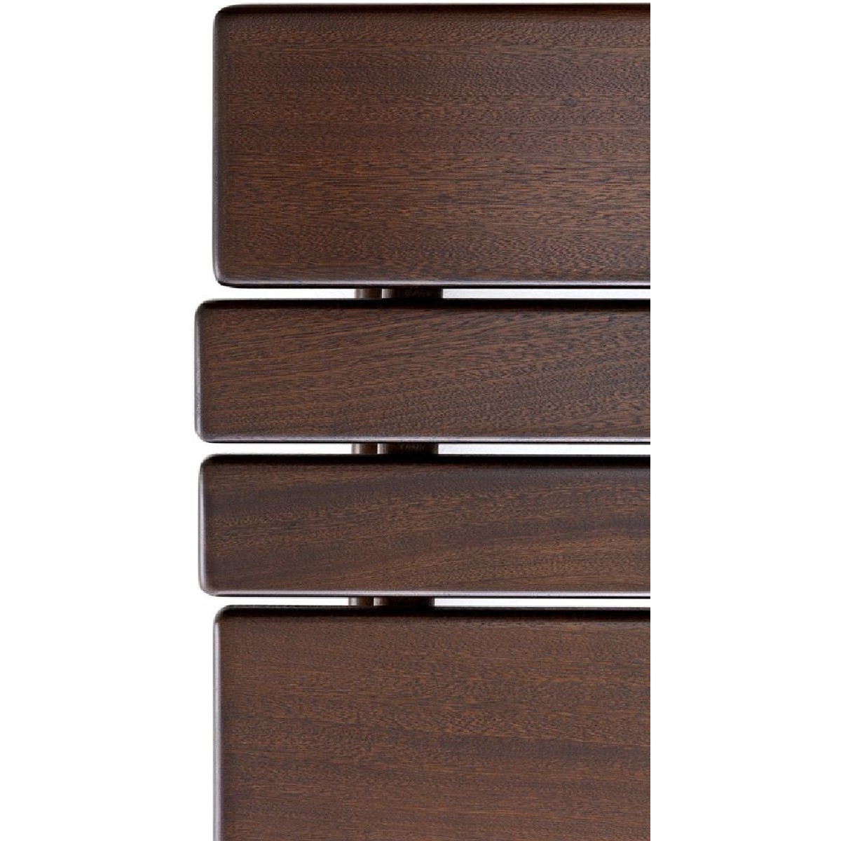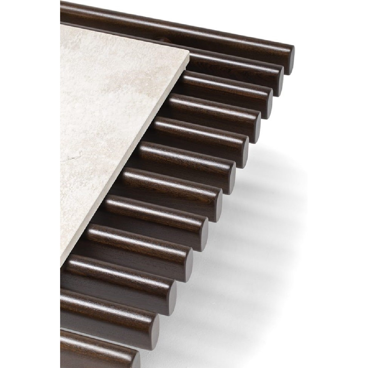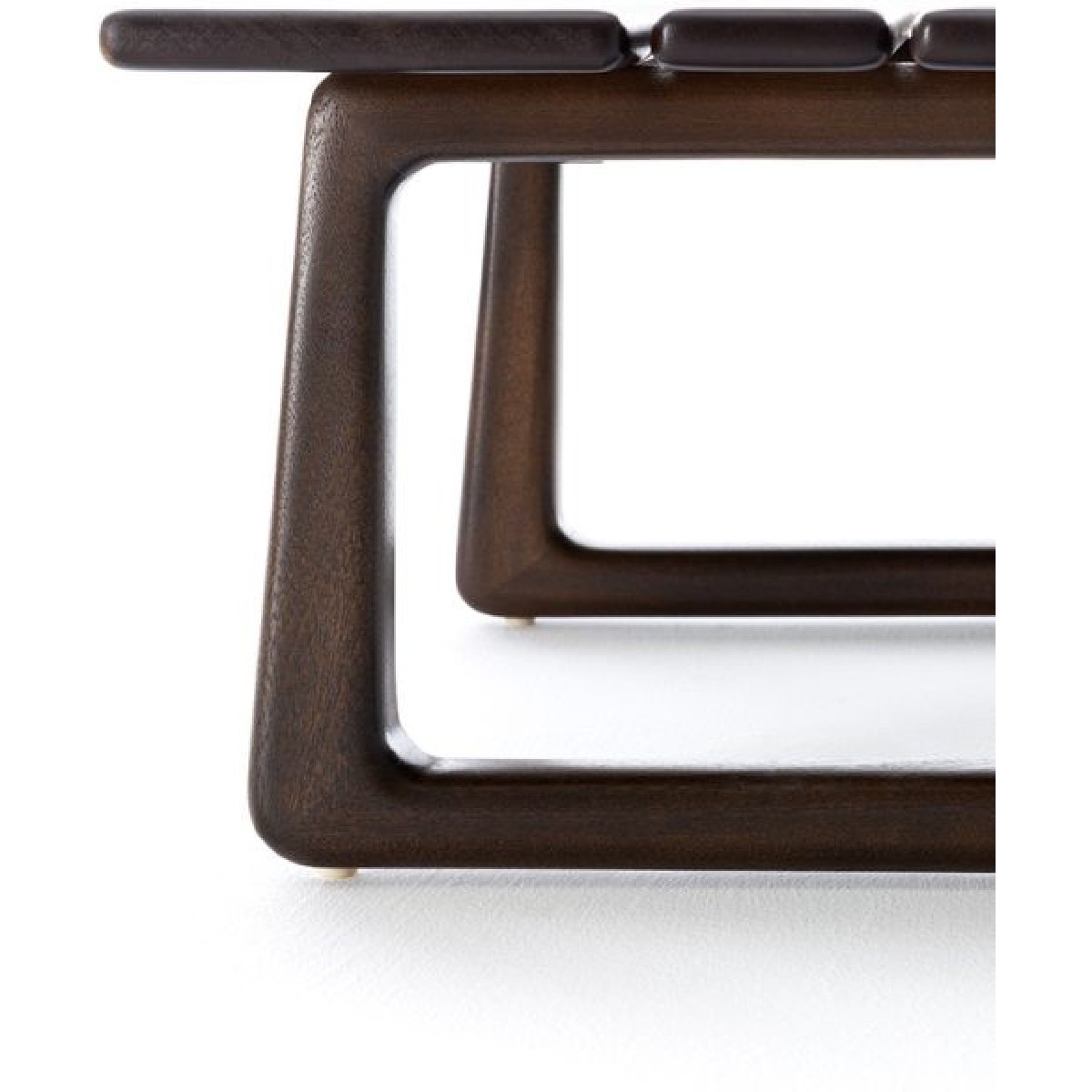 Il design a stecche ammorbidite in mogano Sapelli e i piedini in gomma bianca dialogano con le forme degli altri pezzi della collezione The Delight Chairs, creando un collegamento naturale tra tutti i prodotti.