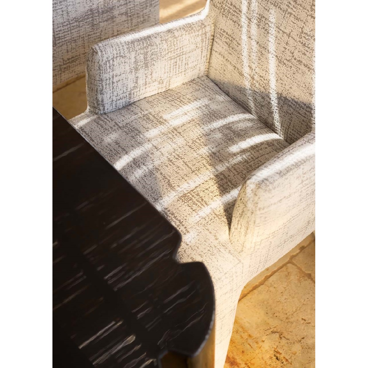 Il sottilissimo piano rettangolare è incorniciato dal perimetro, intagliato ad arte per accogliere le gambe monolitiche.