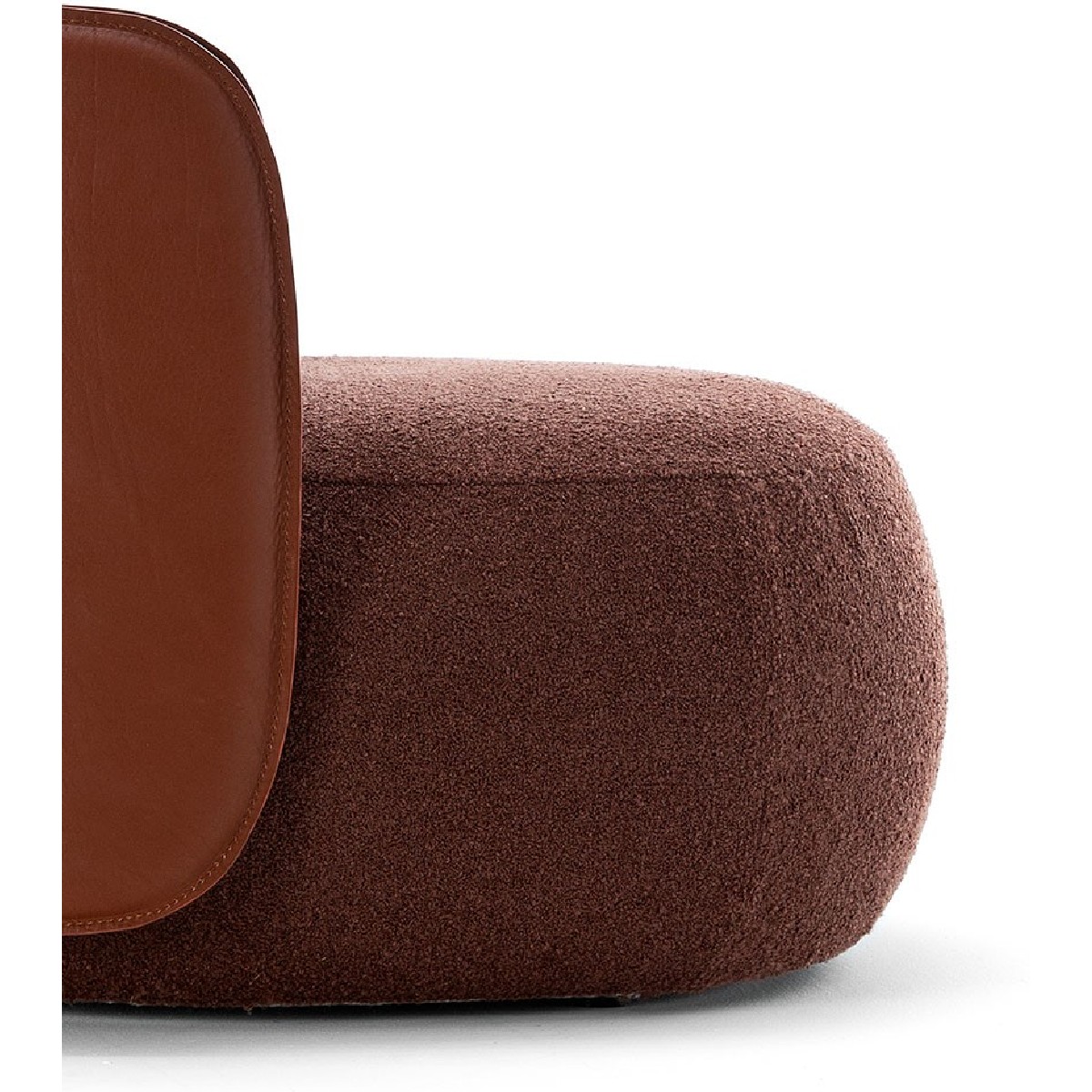 Lo schienale rigido in cuoio accoglie i volumi soffici della seduta e del cuscino, in un abbraccio che esalta una visione giocosa e allo stesso tempo sofisticata del design.