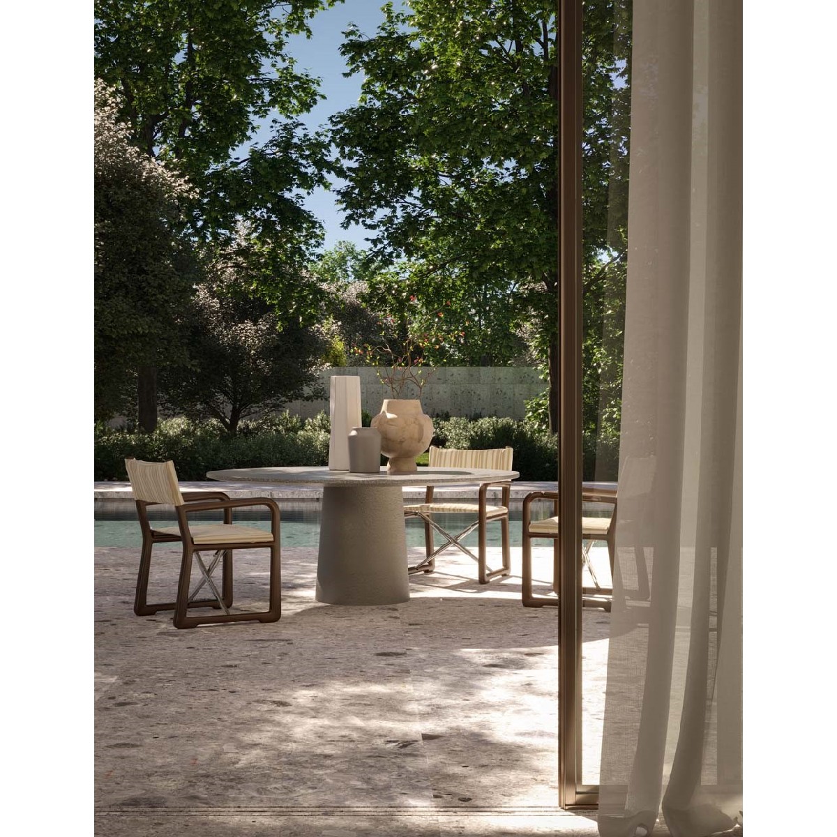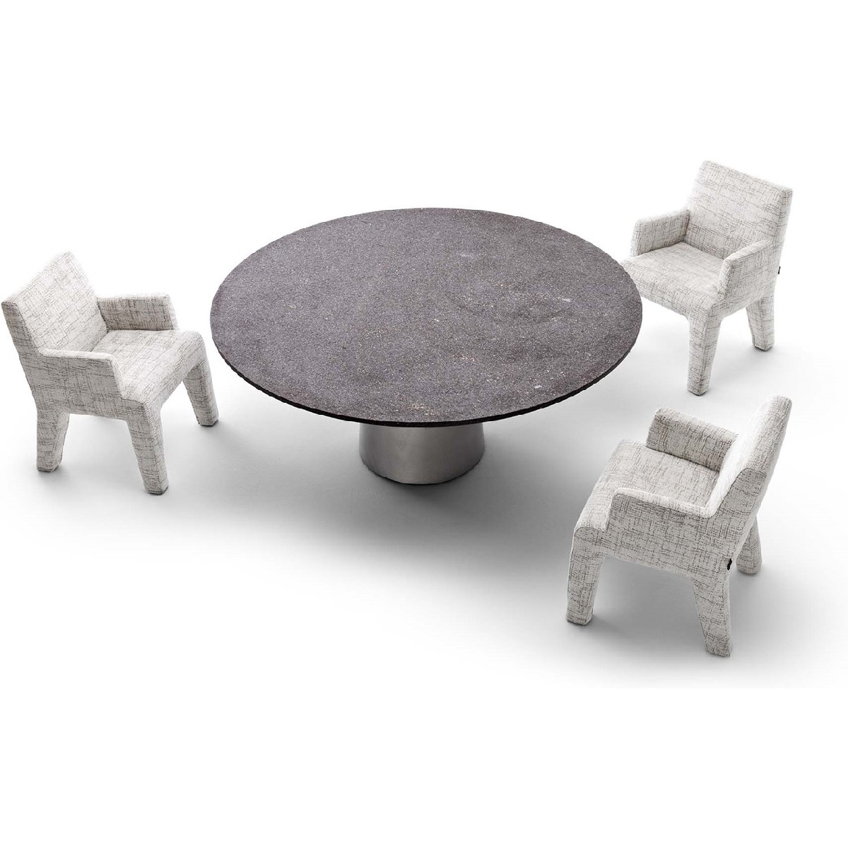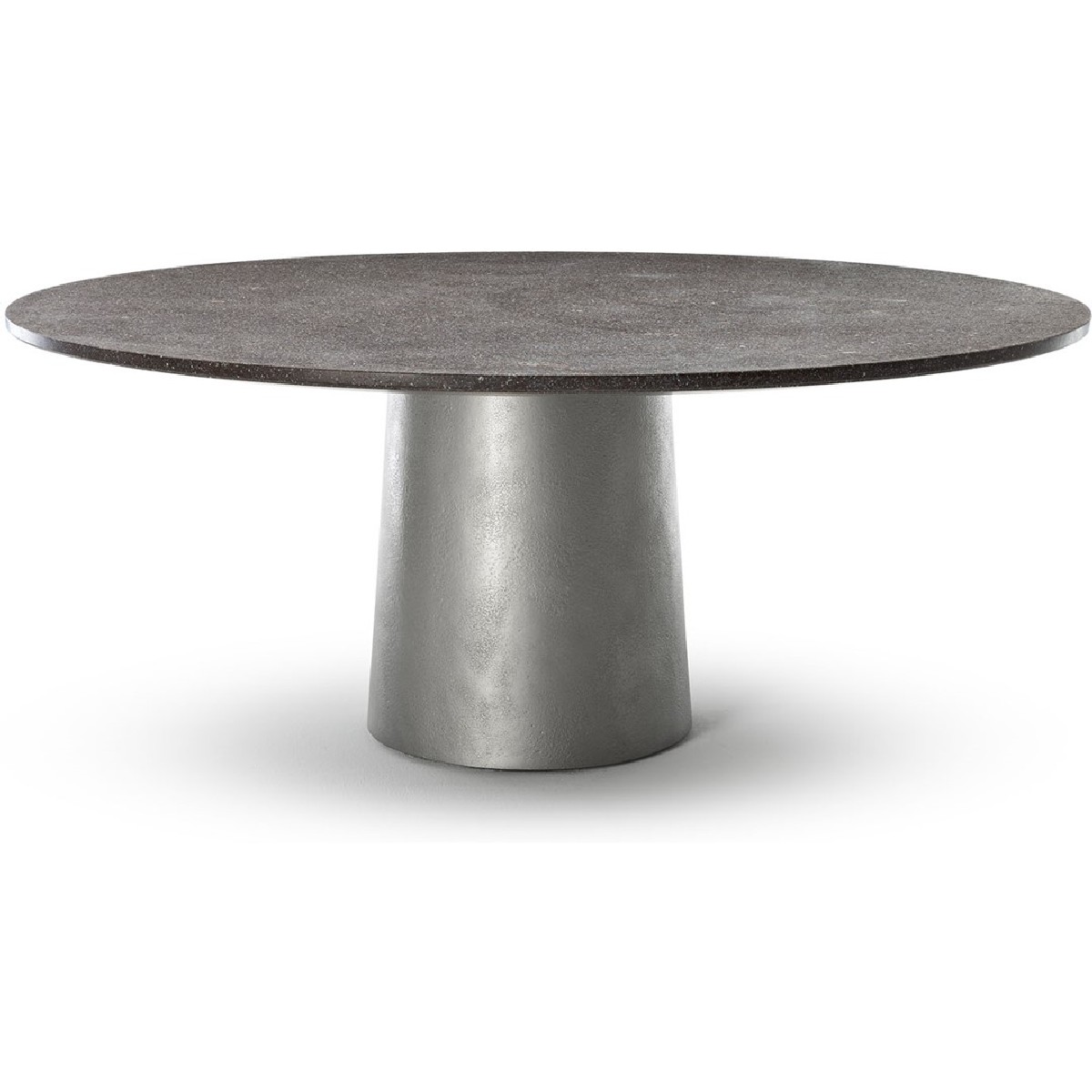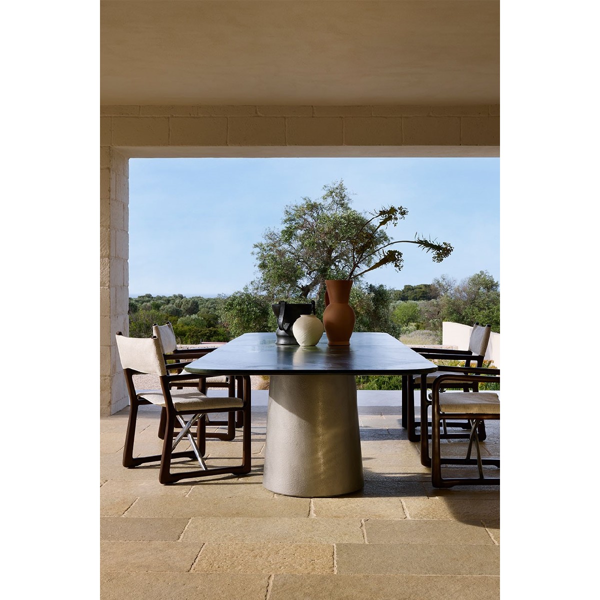 Leggerezza e monumentalità. Pietre antiche e materiali innovativi. Ispirato alle energie primordiali che si muovono sotto la superficie terrestre, questo tavolo si presta a diventare un punto di riferimento all'interno di qualsiasi zona outdoor.