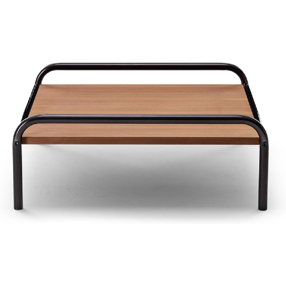 Come le sedute dell'omonima collezione, anche questo tavolino ha una struttura tubolare in acciaio inox che sostiene un ampio piano in mogano.