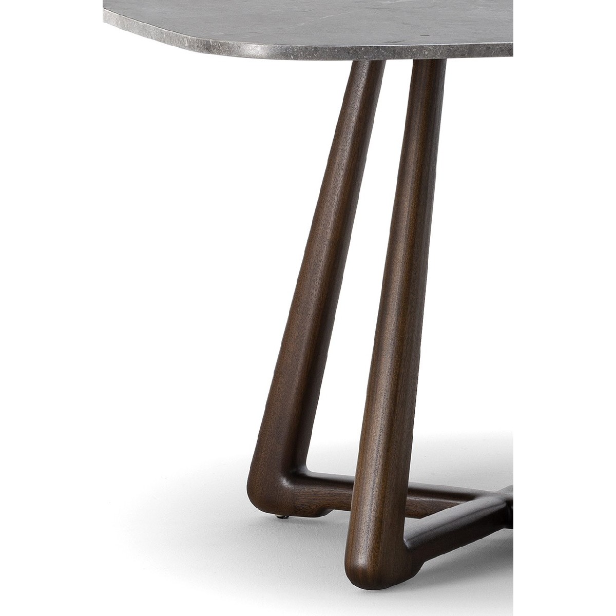 Legno e marmo si esaltano reciprocamente dando vita a un tavolo dalle linee armoniche che invita alla convivialità