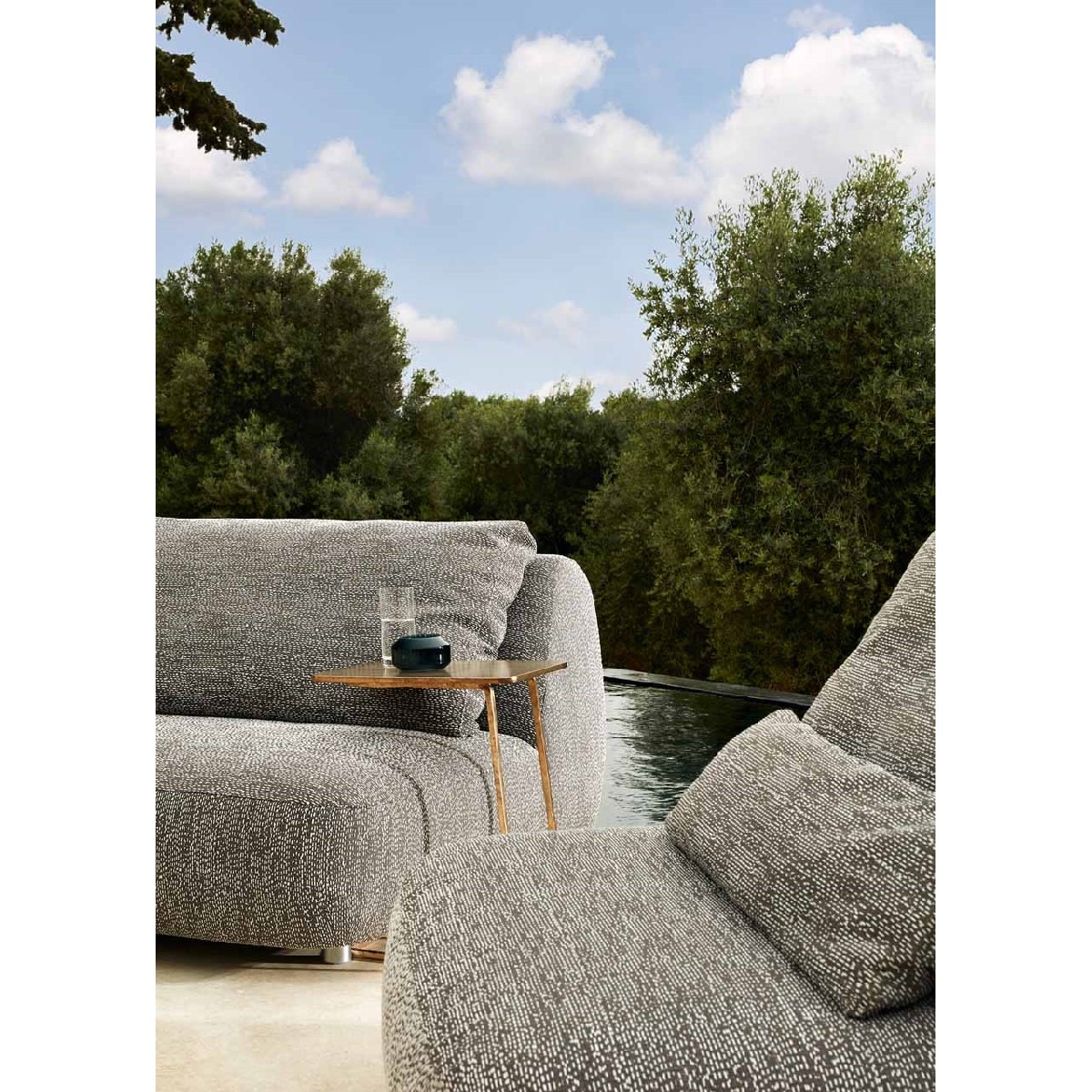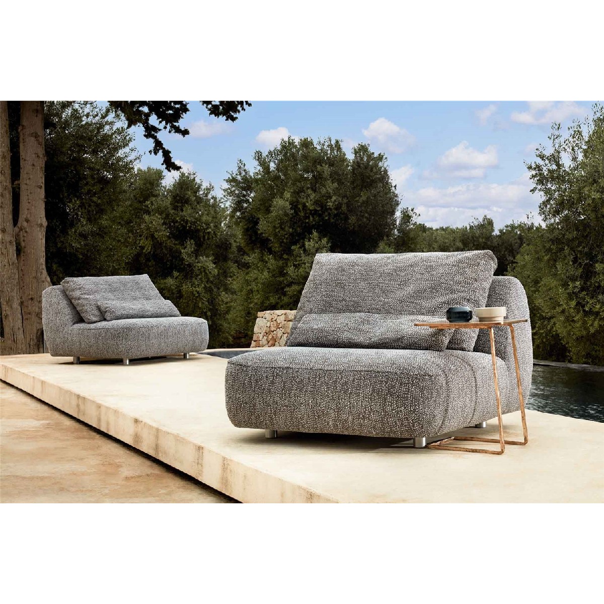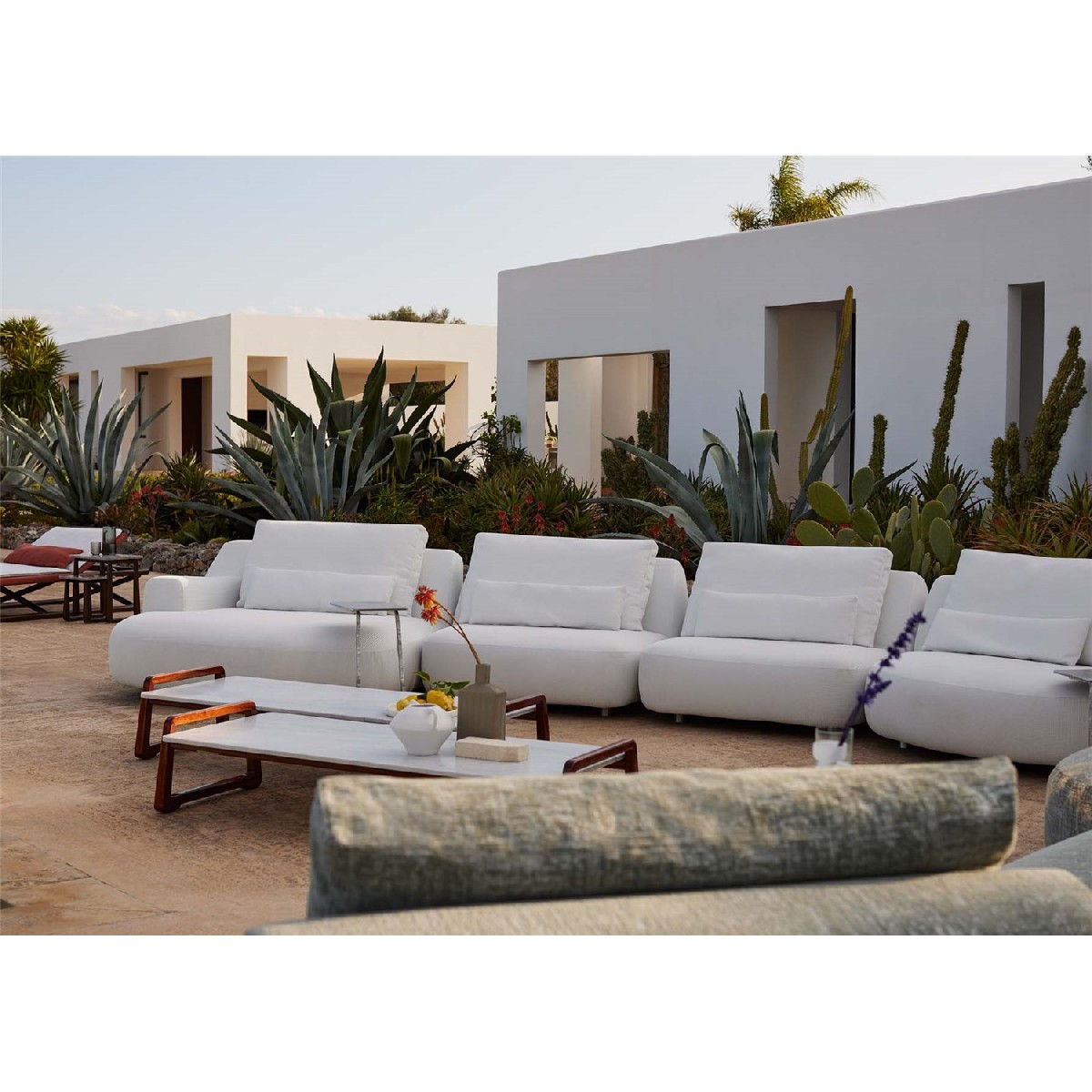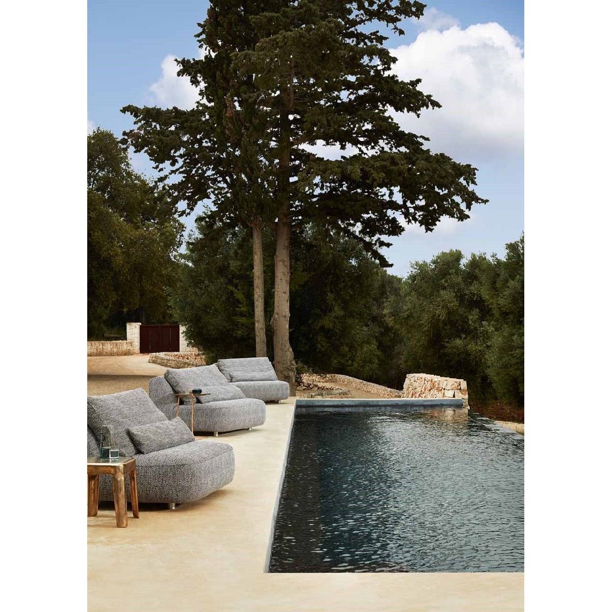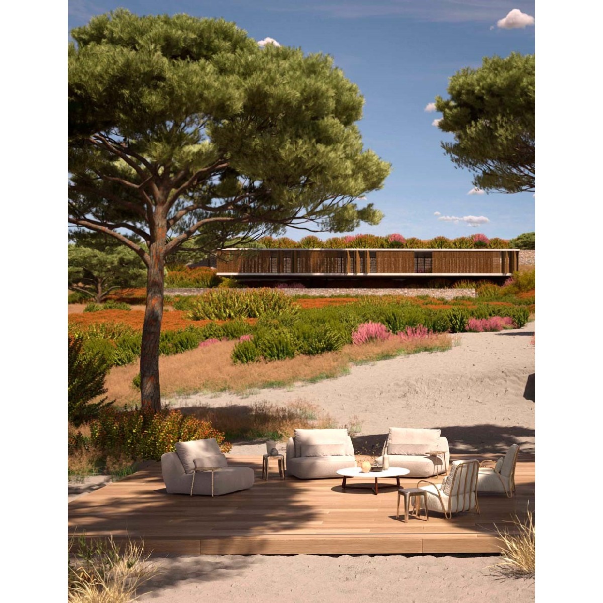 I vari moduli, con o senza bracciolo, possono vivere da soli o insieme, creando diverse composizioni. Schienale e poggiareni completano il divano, perfetto per beach club o zone living a bordo piscina.