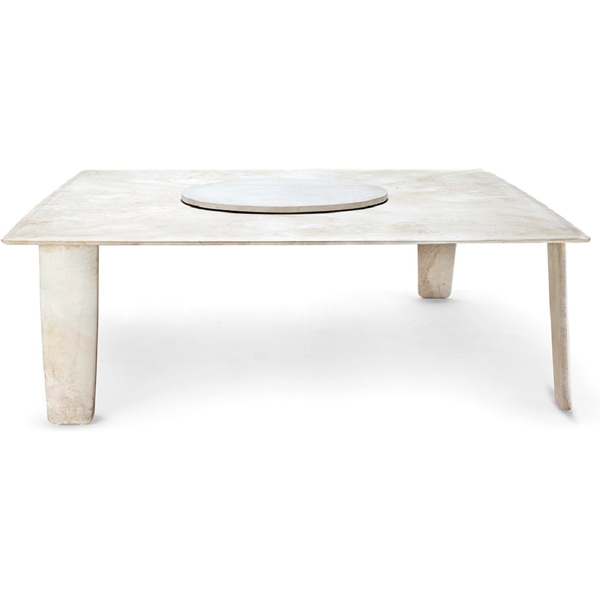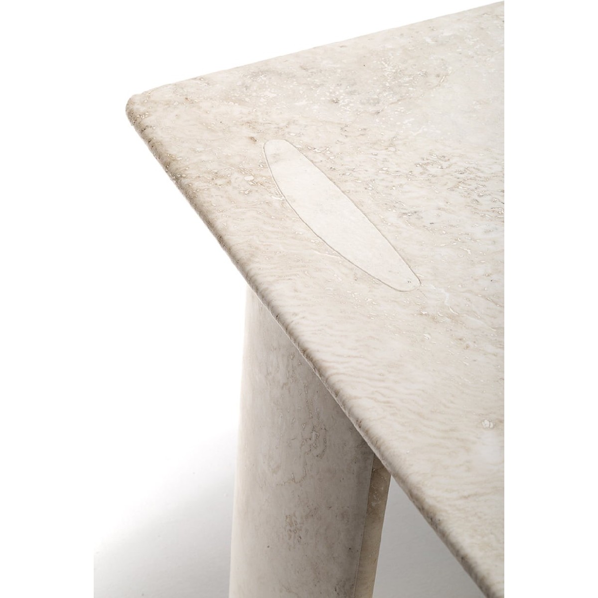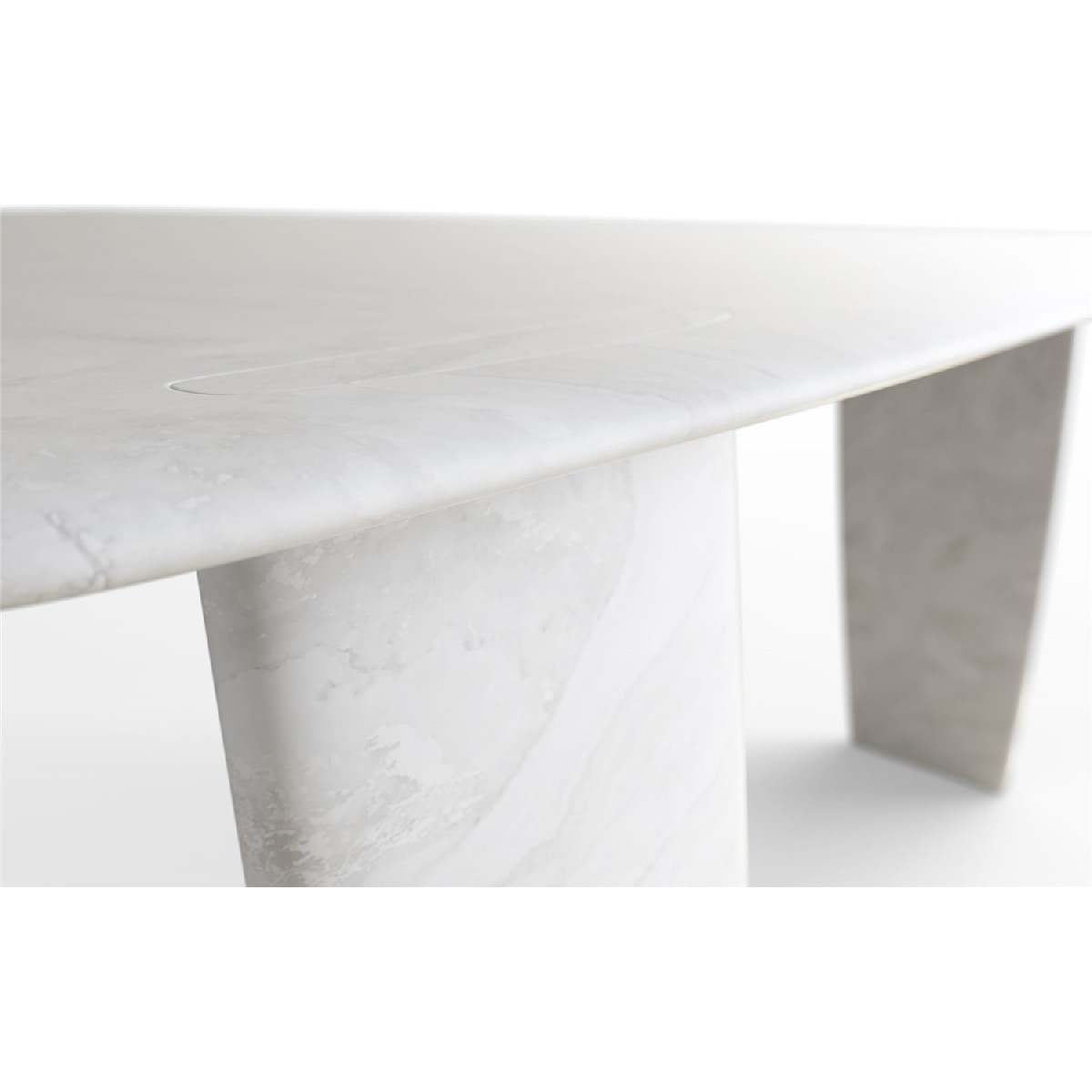 L'equilibrio tra gli elementi è la caratteristica più evidente di Biscuit Dinner Table: il piano è incastonato alle gambe marmoree da giunzioni visibili tra le parti.