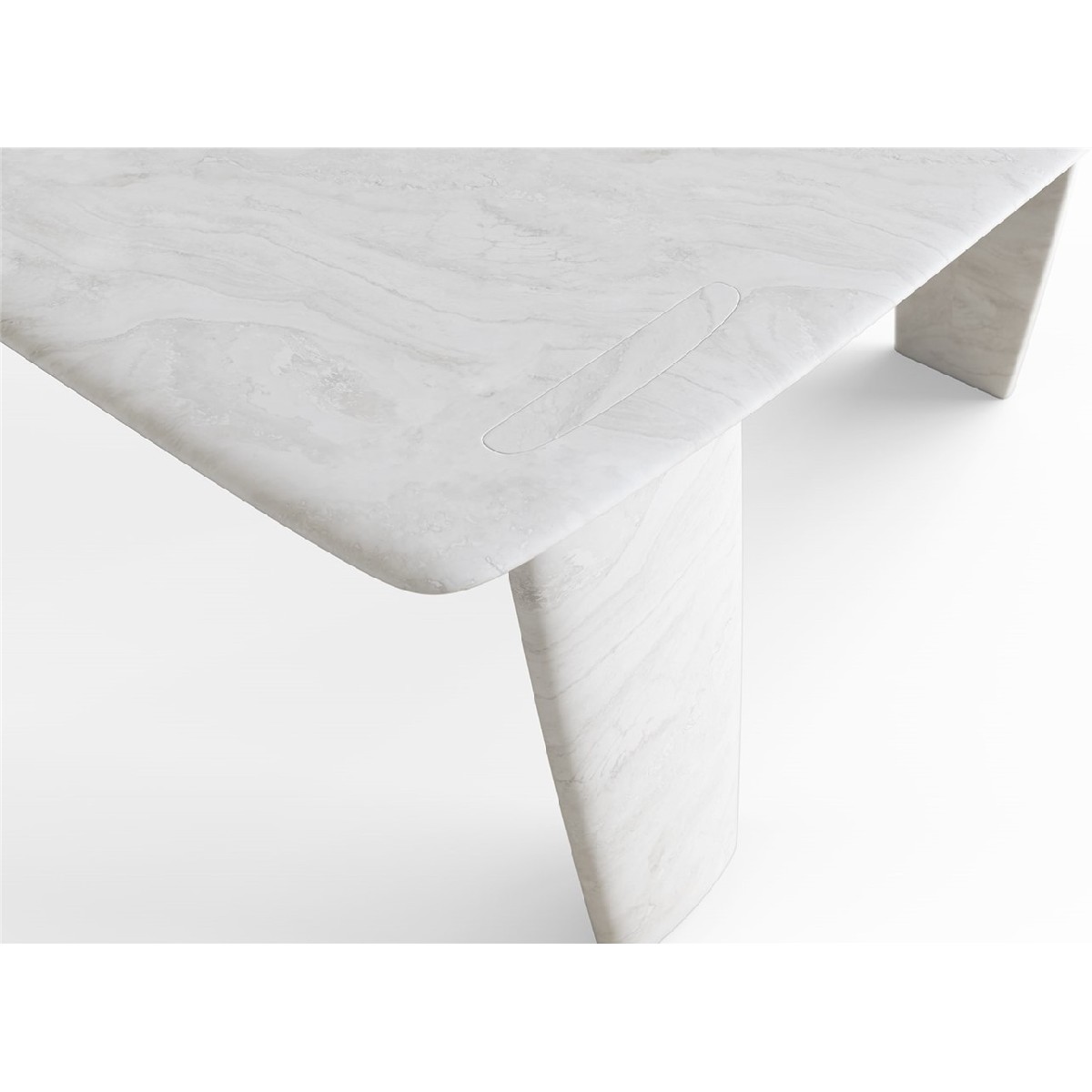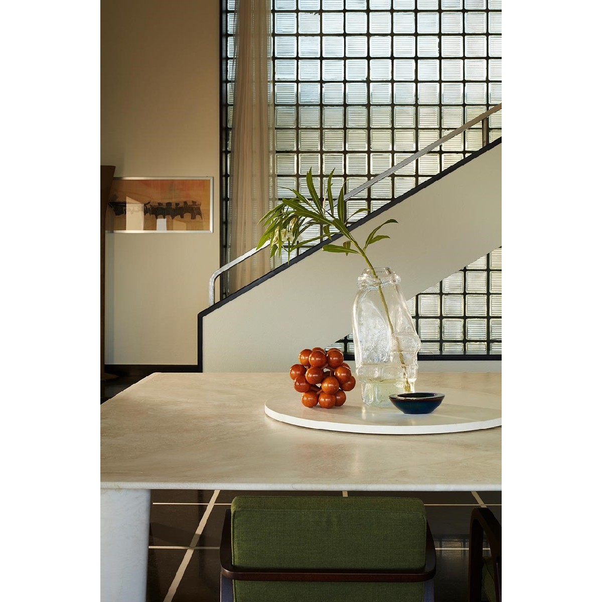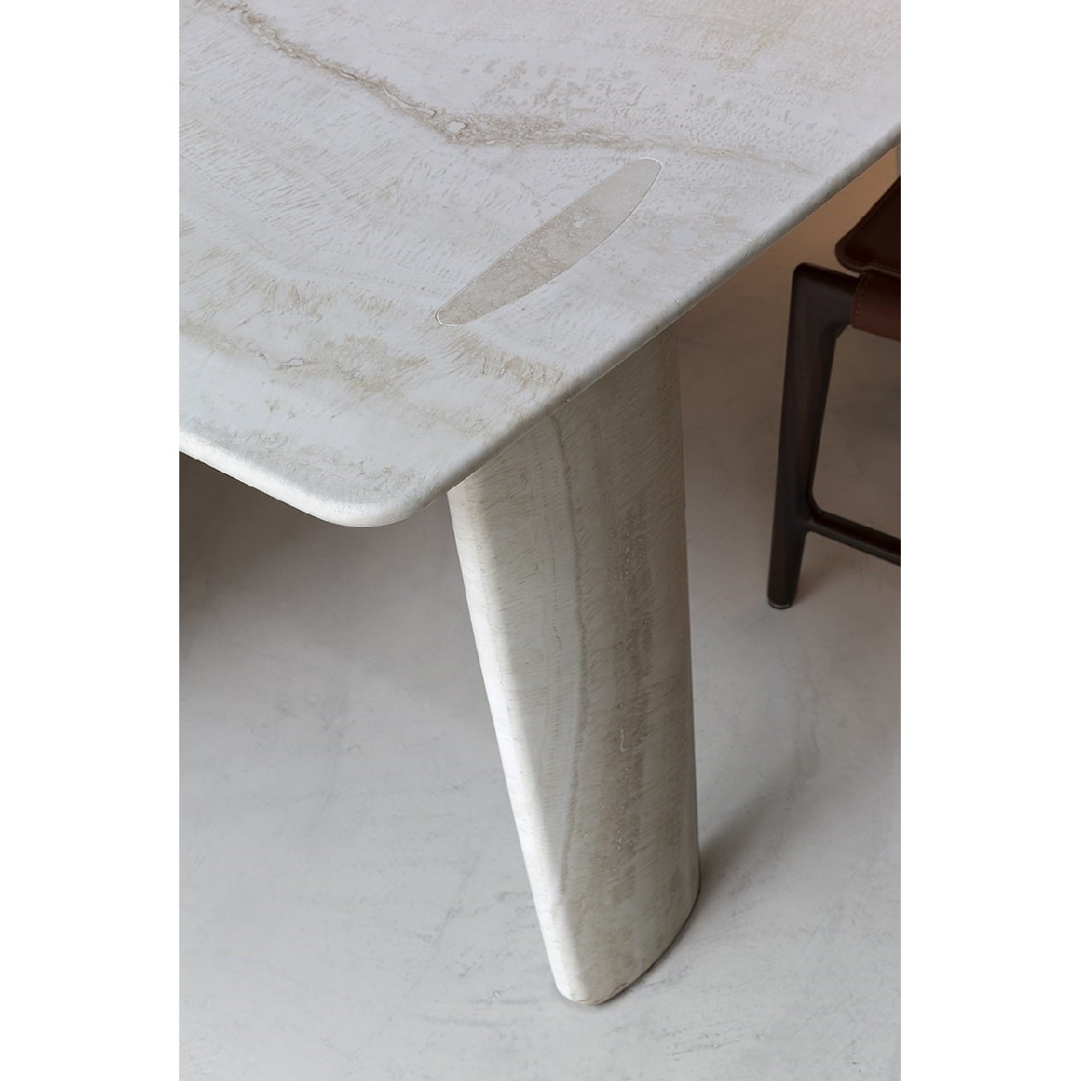 L'equilibrio tra gli elementi è la caratteristica più evidente di Biscuit Dinner Table: il piano è incastonato alle gambe marmoree da giunzioni visibili tra le parti.