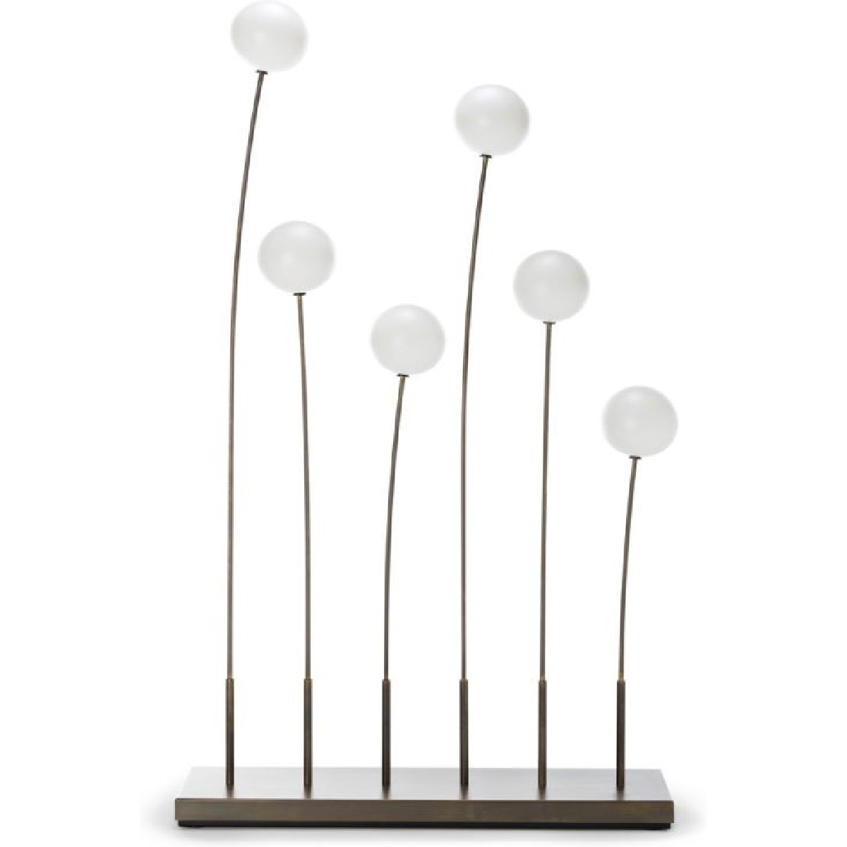 Le sfere luminose richiamano la natura organolettica dei fiori, figurandosi come il peduncolo, e sono collegate agli steli in ottone attraverso piccole e discrete giunture.
