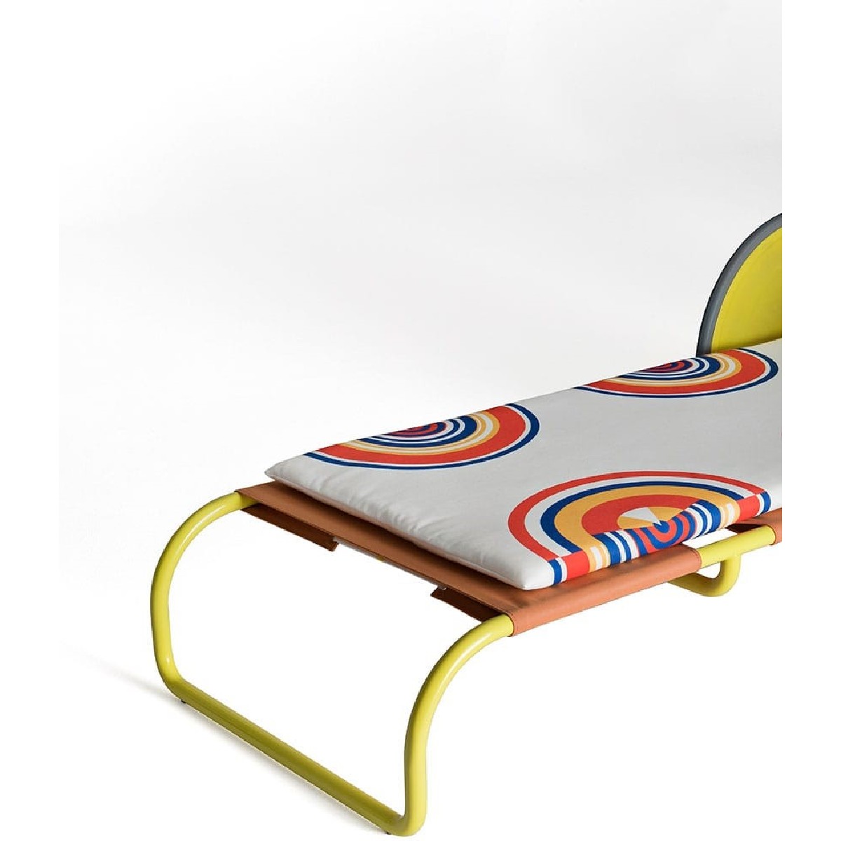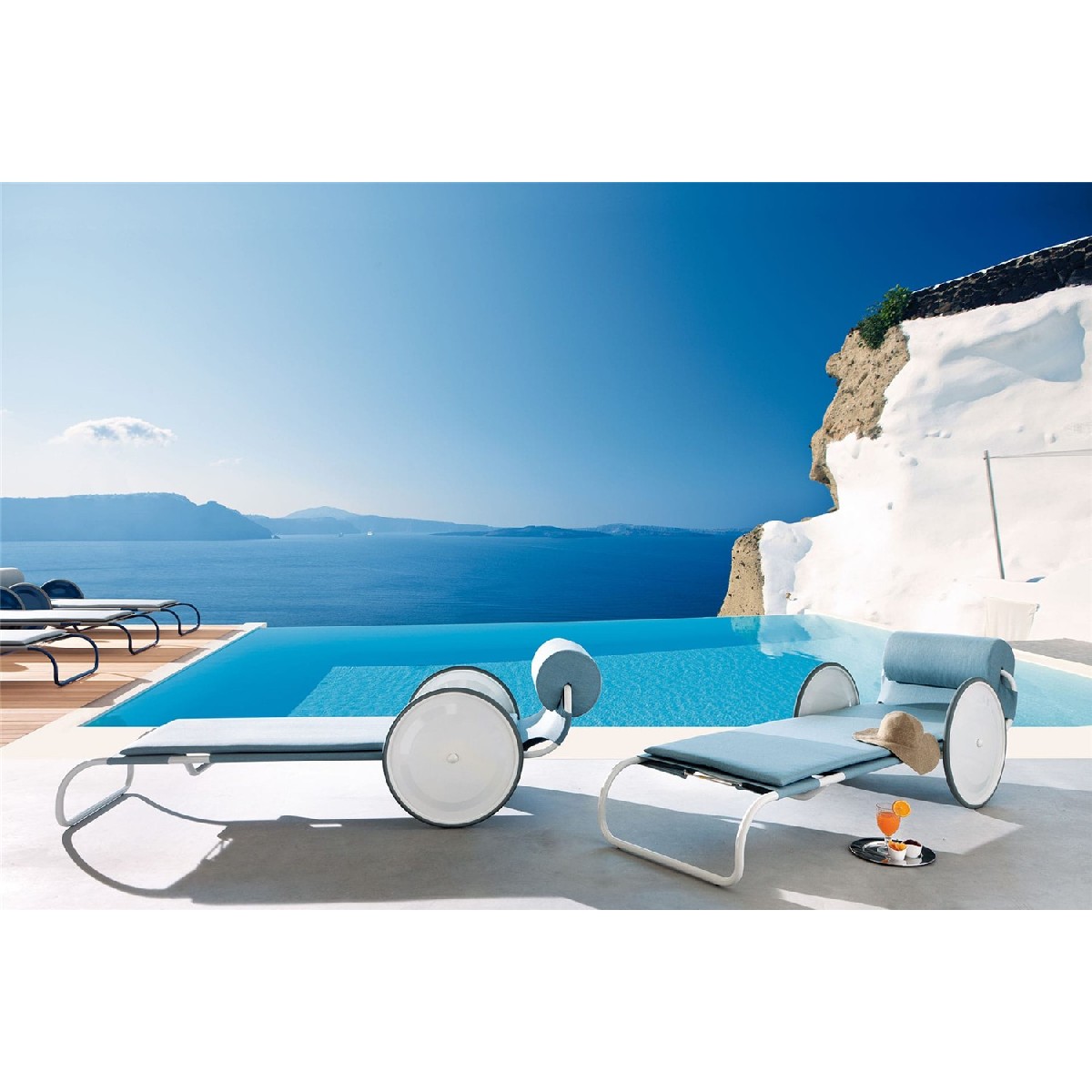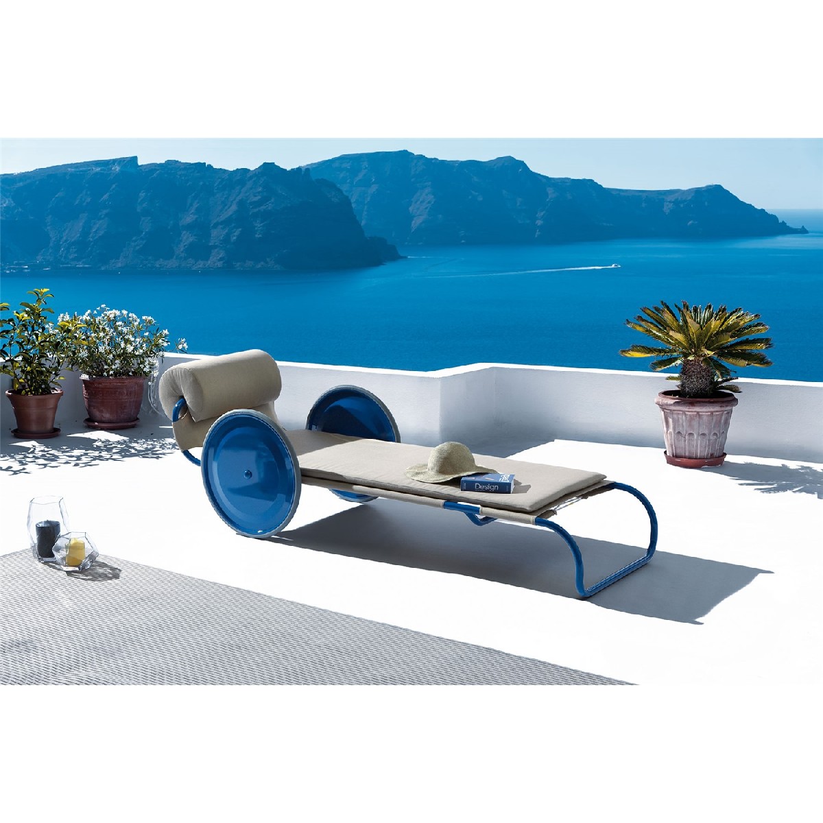 Le eccentriche ruote verniciate dall’ampio diametro sono la caratteristica firma di Locus Solus Sun Longer. Oltre a conferire una spiccata originalità, fungono da tondeggianti braccioli e consentono di spostare agevolmente il lettino prendisole. Il telaio della struttura incornicia la seduta per offrire una perfetta unione tra relax e design.