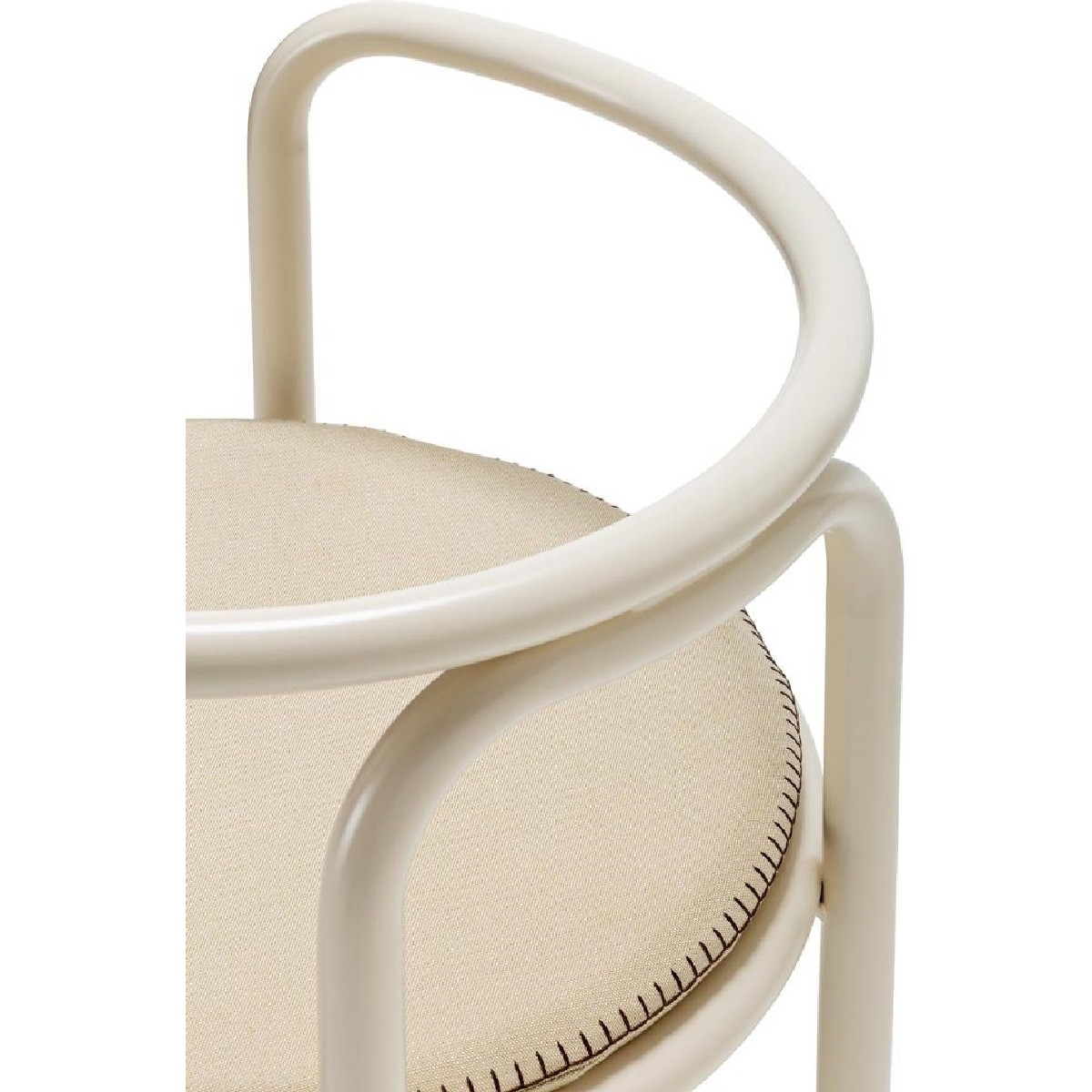 Il telaio di Locus Solus Chair è composto da tubolari in acciaio inossidabile verniciati. Questa capsule collection propone una struttura metallica Off-White con le sedute disponibili in due versioni: a strisce gialle o in tessuto beige con ricami fatti a mano a contrasto.