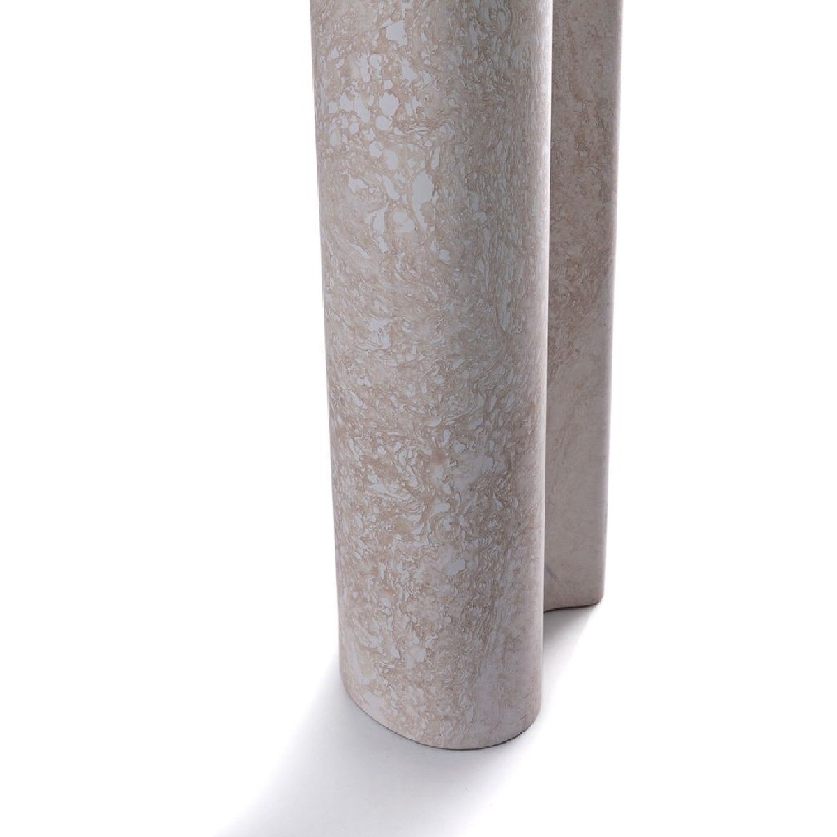 Le venature naturali del marmo e le curve sinuose delle gambe plasmano un elemento outdoor immortale.