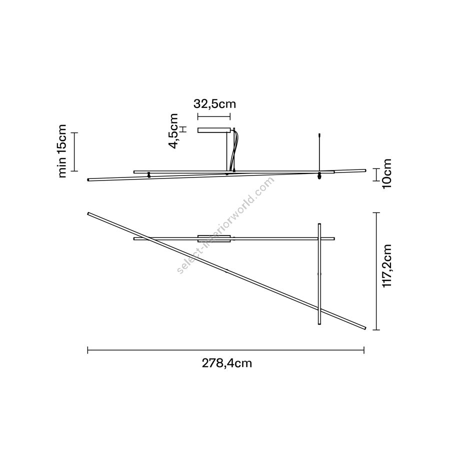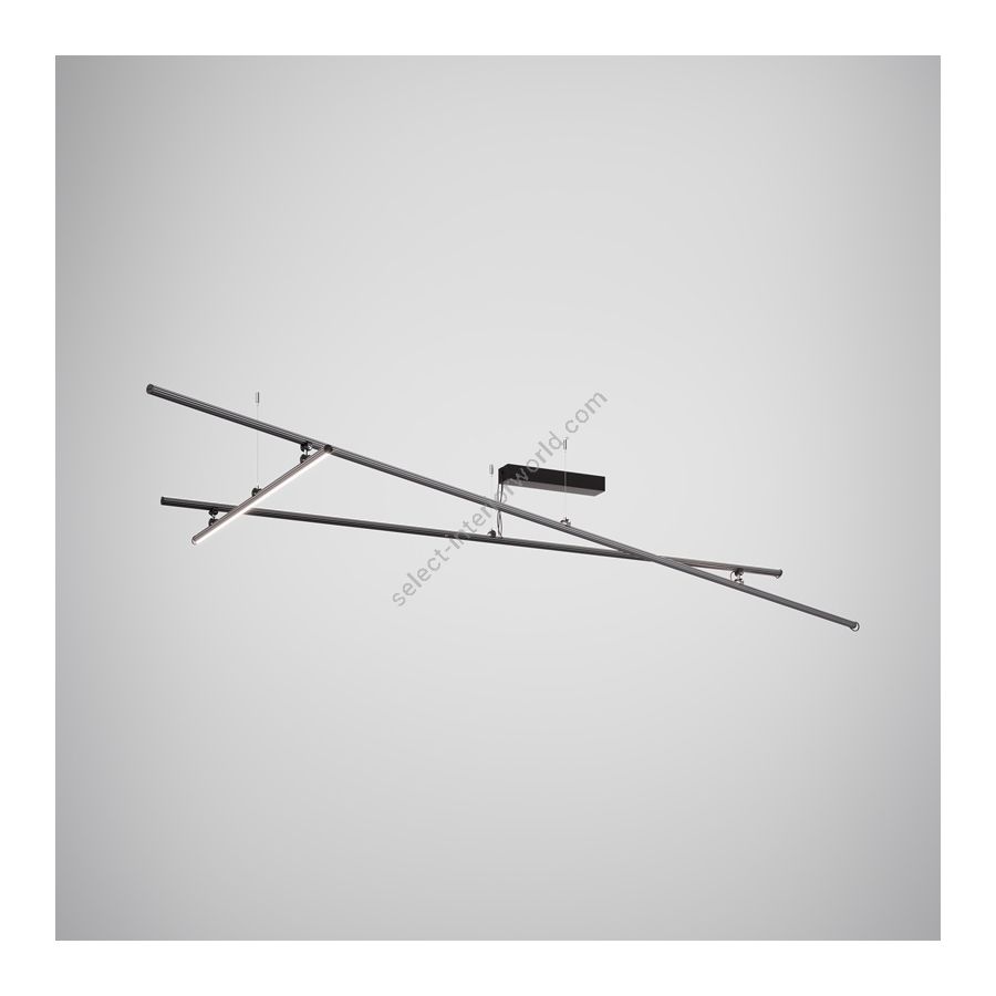 Diese Deckenleuchte aus schwarz eloxiertem Aluminium und bronzefarbenen Stangen ist in einer Größe erhältlich. Die Elektrifizierung erfolgt über Netzspannung für LEDs, die Stromversorgung erfolgt über einen an der Decke platzierbaren Treiber.