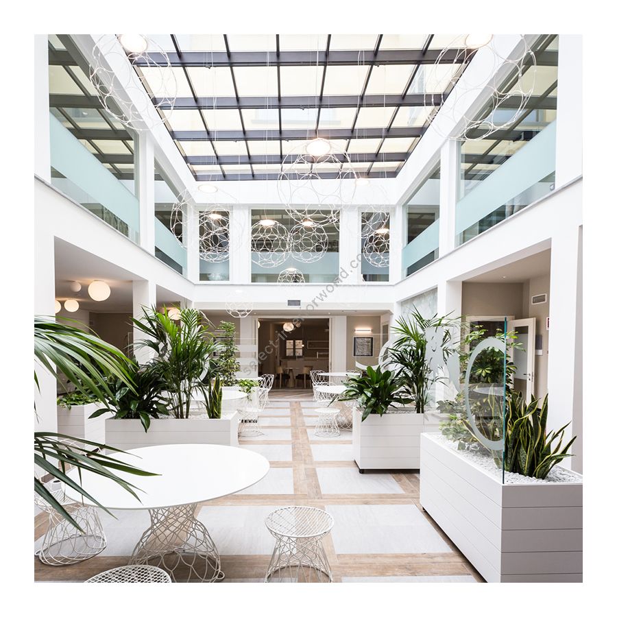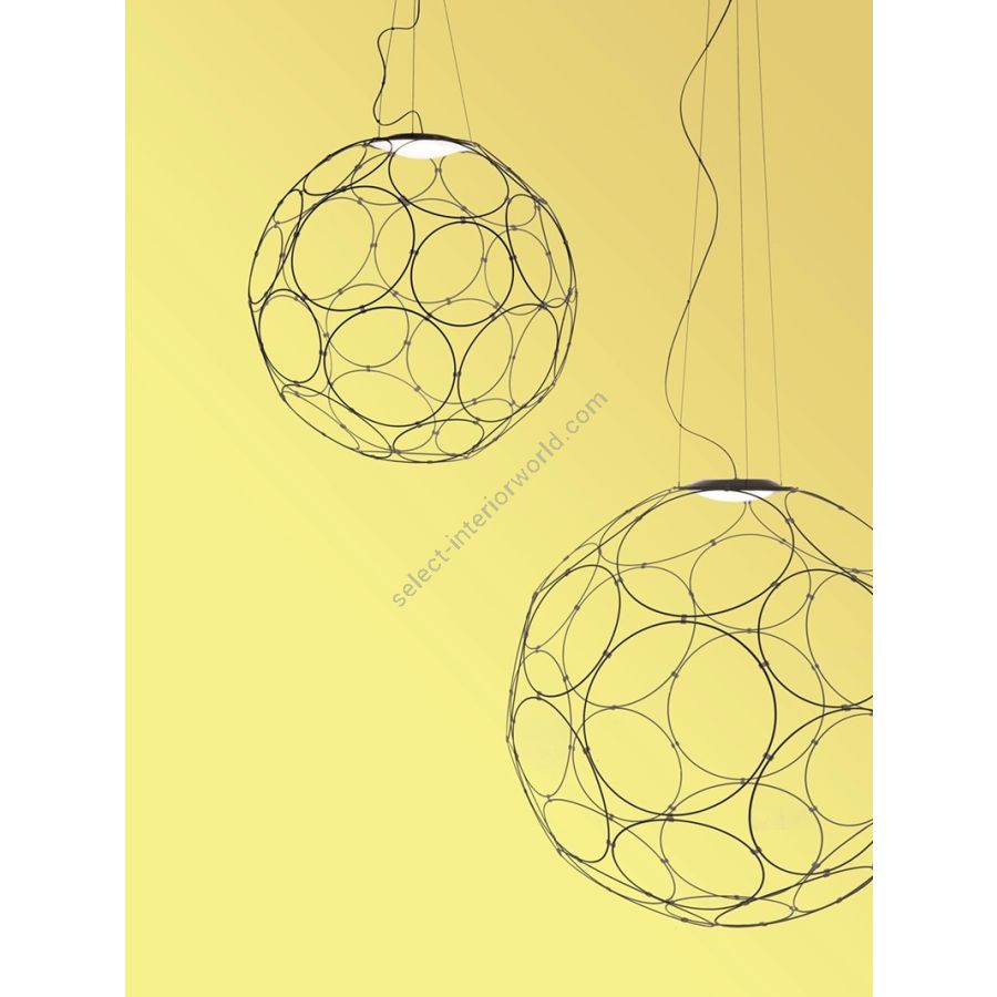 Die Kollektion besteht aus Hängelampen für den Innenbereich, die in zwei Größen erhältlich sind. Beide bestehen aus 32 Ringen mit unterschiedlichem Durchmesser, die zu einer Kugelform zusammengefügt sind. Es gibt auch zwei verfügbare Ausführungen: glänzendes Weiß oder Anthrazitgrau. Die Wahl der Lichtquelle im Inneren der Metallstruktur hängt von persönlichen Vorlieben und Bedürfnissen ab. Die Lampe wird mit Netzstrom betrieben und ist für die Verwendung mit LED-Lampen geeignet.