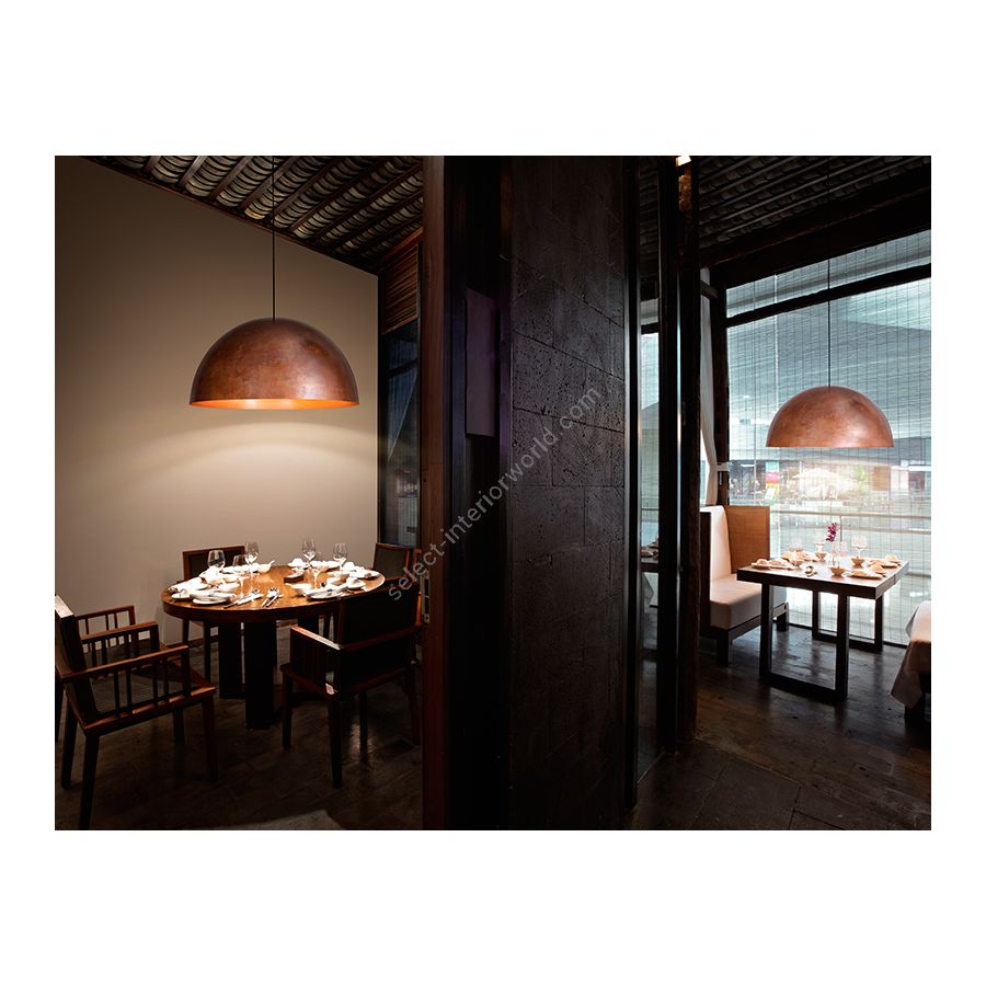 Pendelleuchte mit einer komplett aus Kupfer bestehenden Struktur, außen brüniert und innen poliert.