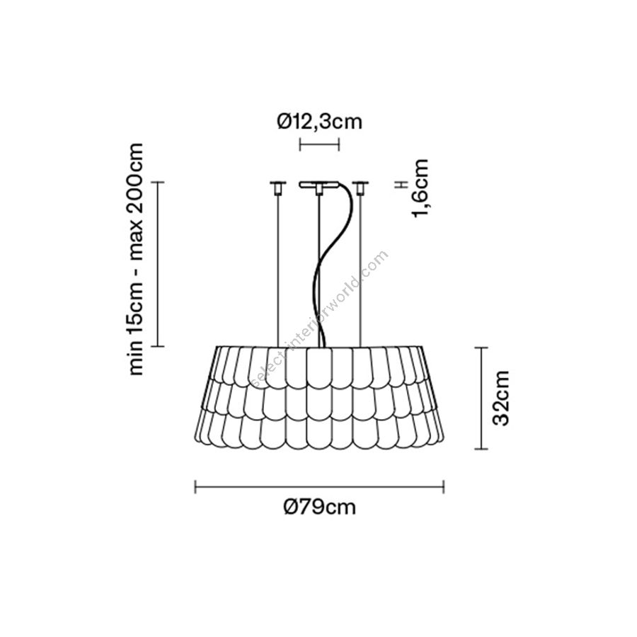 Die Kollektion besteht aus Hängelampen für den Innenbereich in fünf verschiedenen Formen, die auch direkt an der Deckenrosette befestigt werden können, indem man einfach die Kabel kürzt. Der Rahmen ist mit Schuppen aus halbstarrem Gummimaterial in vier verschiedenen Farben (weiß, grau, braun und grün) überzogen, während der runde Diffusor aus weißem Stoff besteht. Die Lampe wird mit Netzstrom betrieben und ist für die Verwendung mit Halogen- und Leuchtstofflampen geeignet.