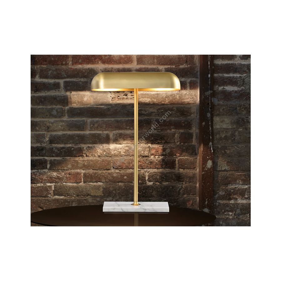 Die Lampe ist aus hochwertigen Metallen in mattem Messing, Zinn und Bronze gefertigt und bietet eine raffinierte Kombination mit Marmoroptionen in Marquina-Schwarz oder Carrara-Weiß, was ein Element von Raffinesse und Auswahlmöglichkeiten hinzufügt, um verschiedene Einrichtungsstile zu ergänzen.