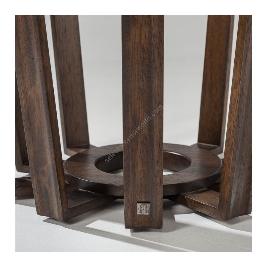 Der Galapagos Beistelltisch 100 simuliert aufgrund seiner konischen Silhouette und seiner imposanten Erscheinung die Form eines Vulkans. Die allgemeine Struktur dieses Tisches besteht aus Massivholzstücken und einer runden Glasplatte, die den Lichteinfall ermöglicht, um die Details der Basis zu würdigen.