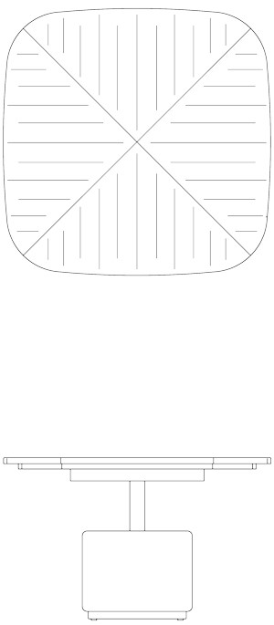 Seine quadratische Basis aus Holz hat abgerundete Ecken, um die Form seiner Oberseite zu ergänzen. In seiner hölzernen Spitzenversion gibt es ein Treffen von radialen Furniermustern, die den Schliffen eines Diamanten ähneln.