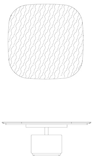 Seine quadratische Basis aus Holz hat abgerundete Ecken, um die Form seiner Oberseite zu ergänzen. In seiner hölzernen Spitzenversion gibt es ein Treffen von radialen Furniermustern, die den Schliffen eines Diamanten ähneln.