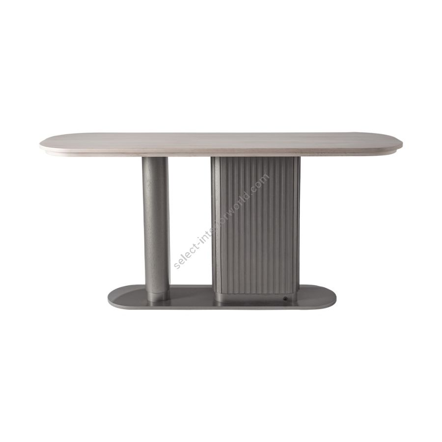 Die Struktur dieser leichten Konsole wird von zwei Sockeln getragen, einer mit geriffelten Details und einer mit glatter Oberfläche, beide Sockel teilen ästhetische Merkmale mit anderen Stücken dieser Kollektion. Die Platte kann aus Holz oder Marmorquarzit bestehen, um der Konsole eine größere Vielseitigkeit zu verleihen. Dieser Konsolentisch ist ideal für Foyers, Wohnzimmer und Esszimmer.